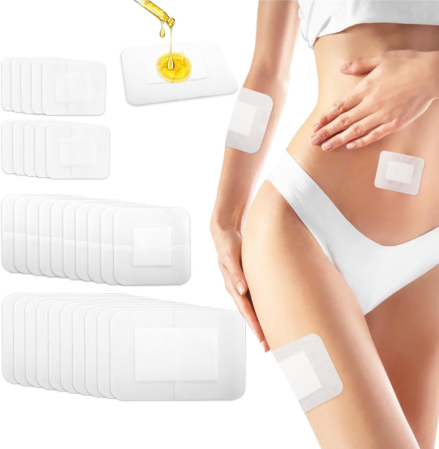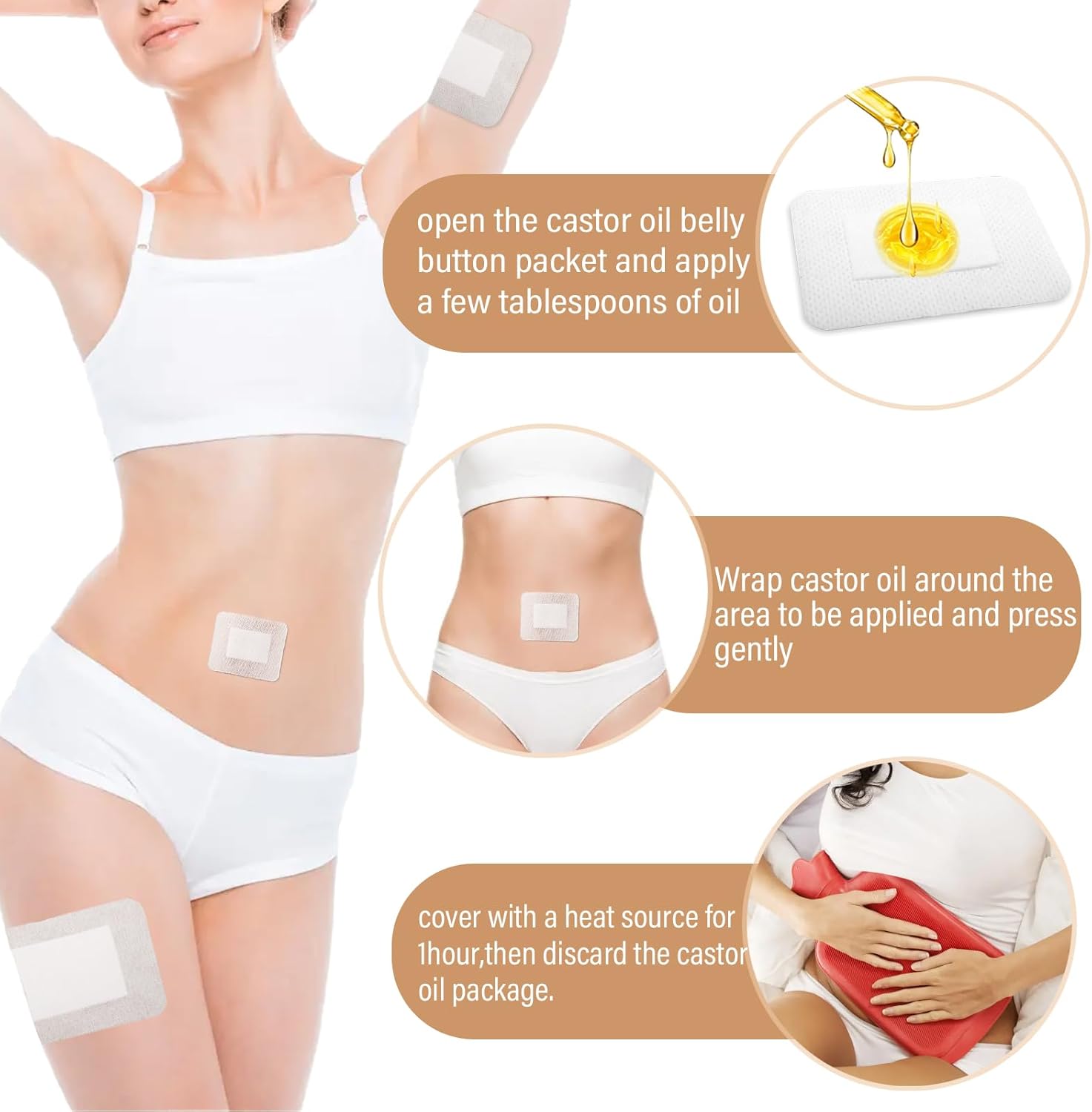 【Package Includes】You will receive 30pcs castor oil patches in 3 sizes (10x15cm, 10x10cm, 6x7cm) 10 pieces each. Self-adhesive designs fit your body's skin well and can maximize the contact between skin and castor oil, with good efficacy. Castor oil not included..【Premium Comfort】Made with breathable spunlace non-woven fabric, these castor oil pack wraps are ultra-soft and skin-friendly. Built-in cotton cores efficiently absorb/lock oils for leak-free use..【No Wash】Our castor oil pads are single-used and can be discarded after use. It is also convenient for you to replace it at any time. It's no need to wash them. Saving you precious time and efforts..【Easy to Use】Our castor oil patches are lightweight and easy to carry.You just need to peel off the release paper, add a few tablespoons of castor oil, and stick it on your belly button. You can choose a cold compress or a hot compress to enhance using effect..【Practical Gift】Ideal for relaxation, muscle relief, or self-care rituals. These castor oil pack wraps make thoughtful gifts for moms, friends, or anyone prioritizing holistic health.