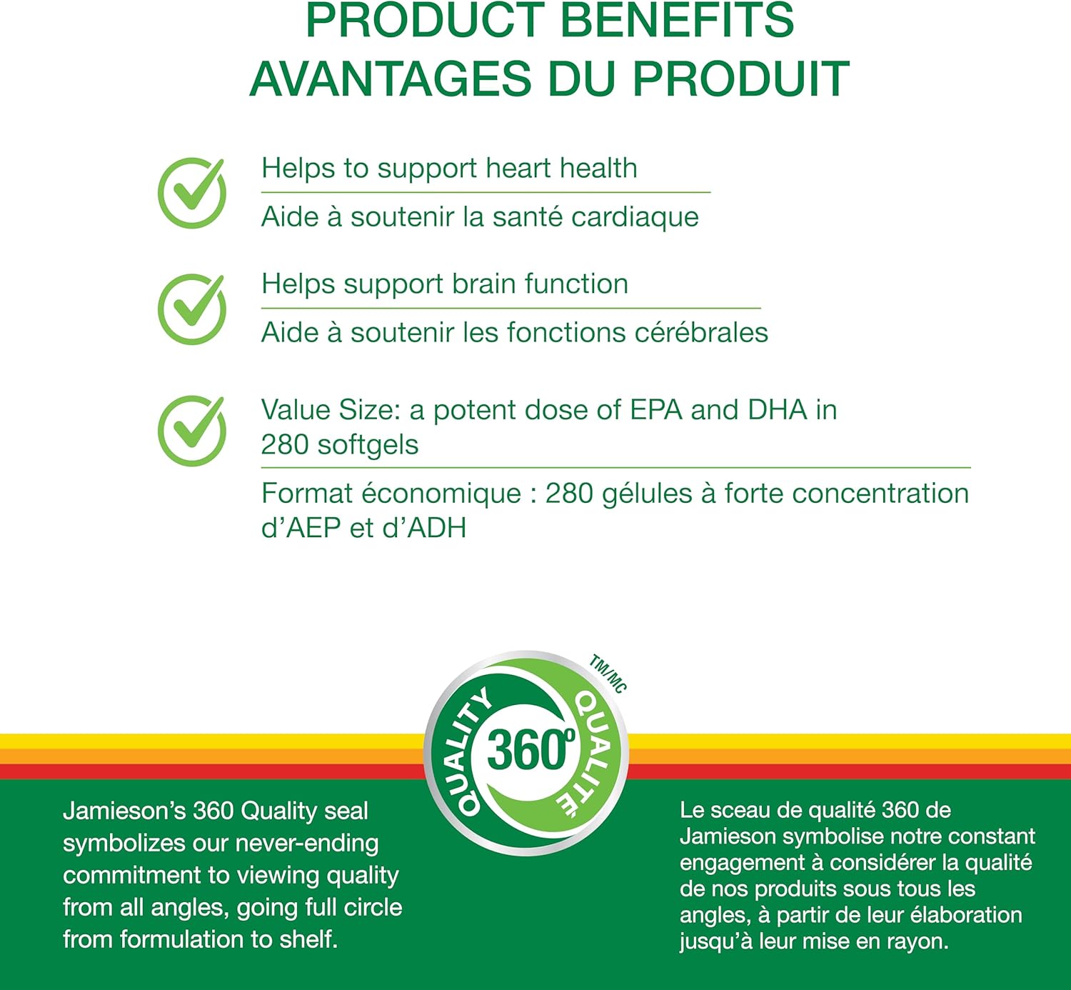 Jamieson Wild Salmon and Fish Oil 1,000 mg Softgels, Value Size, Supports Heart and Brain Health. With Wild Alaskan Salmon, Menhaden, EPA and DHA, Non-GMO, Gluten-Free, 280 Count, Proudly Canadian