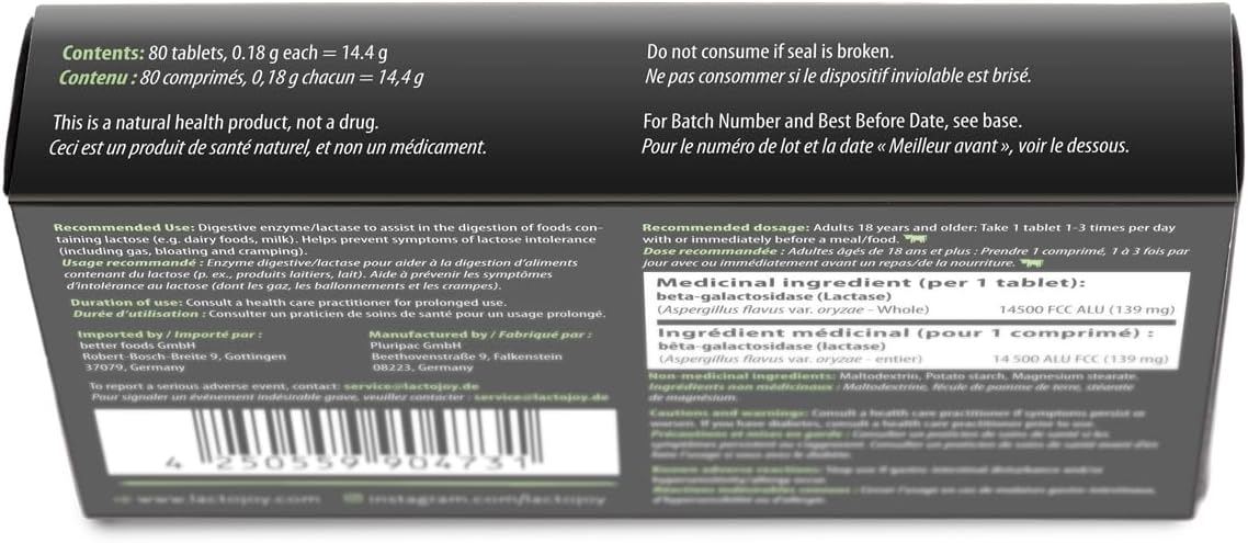 Lactose intolerant? If you are, then you know full well how it can be a source of frustration. It can be sometimes debilitating, cramping our lifestyles. We can’t just eat what we want, missing out on the joys of delicious cheese, ice cream, milkshakes and even mac and cheese! And of course the physical effects can be hard to bear. Thankfully, there are now lactase enzymes and supplements that can help relieve its symptoms. Enjoy Dairy again with LactoJoy Lactase Tablets! LactoJoy Lactase Tablets are natural digestive supplements that can help those with lactose intolerance be able to digest dairy without suffering from bloating, gas, stomach aches, among other symptoms. Made of high quality and all natural ingredients, LactoJoy guarantees you get nothing but lactase enzymes - and not any unnecessary additives. How much lactase enzyme tablets one should take depends on many factors, specifically how much lactase is in the actual meal you are about to eat. LactoJoy can be taken daily, with every meal with your first bite or sip of dairy. Still not convinced? Here are a few more things about LactoJoy’s Lactase Tablets: ● A Vegan friendly, gluten free product. ● Contains 14.500 FCC of lactase enzymes per tablet. ● Ingredients include lactase & organic potato starch. ● Do not take more than 10 tablets a day.