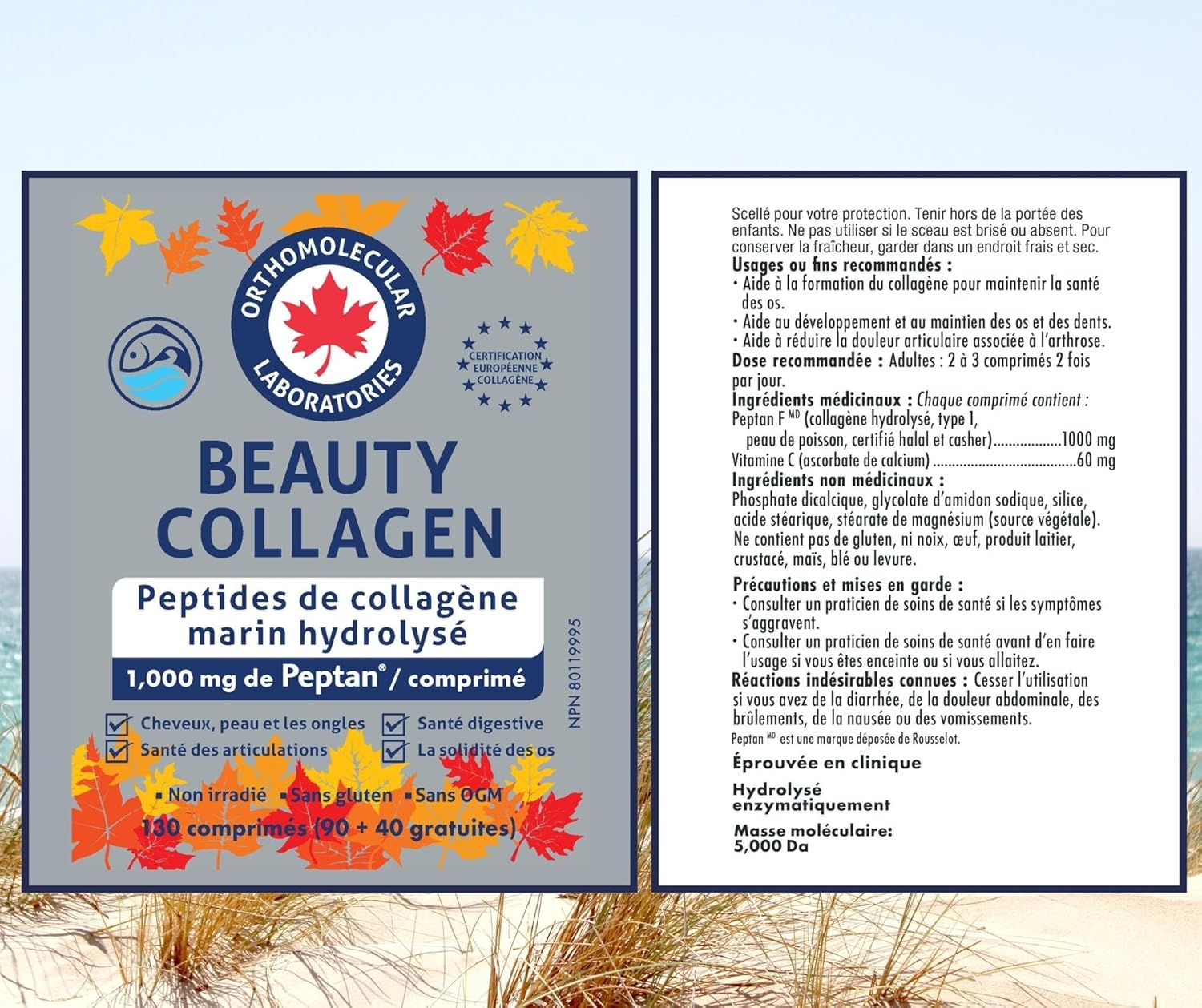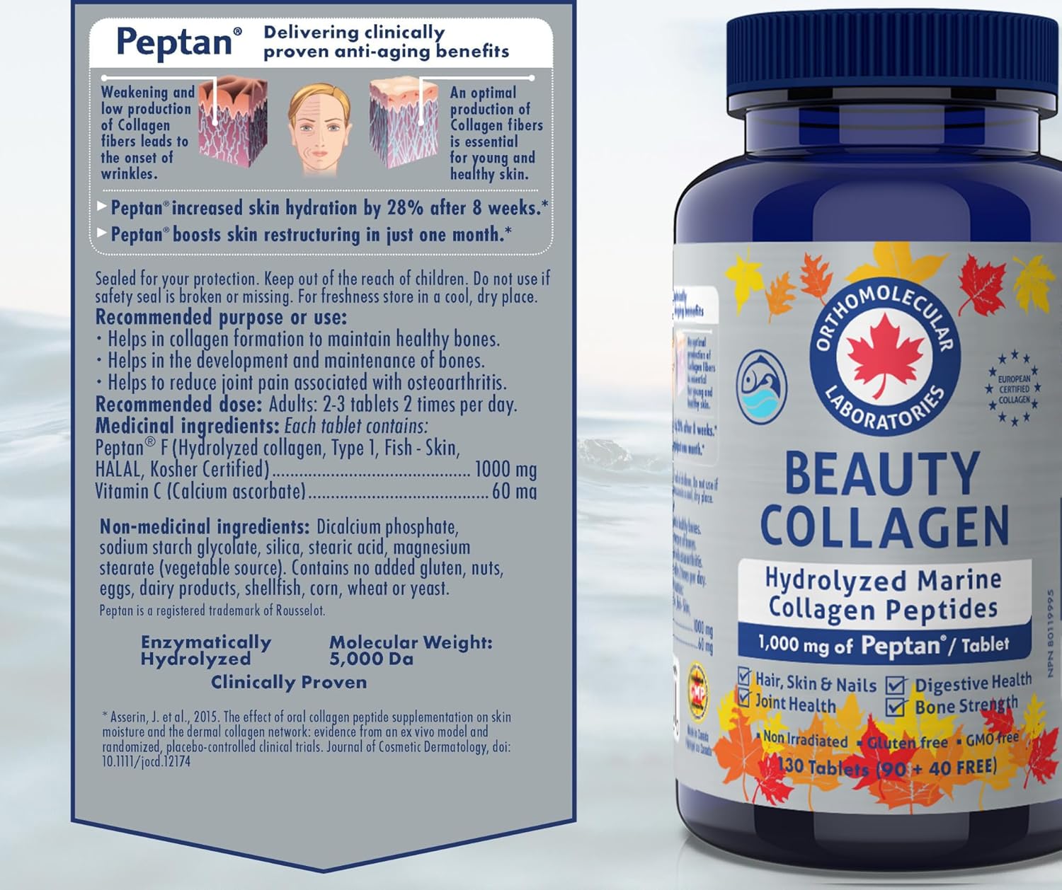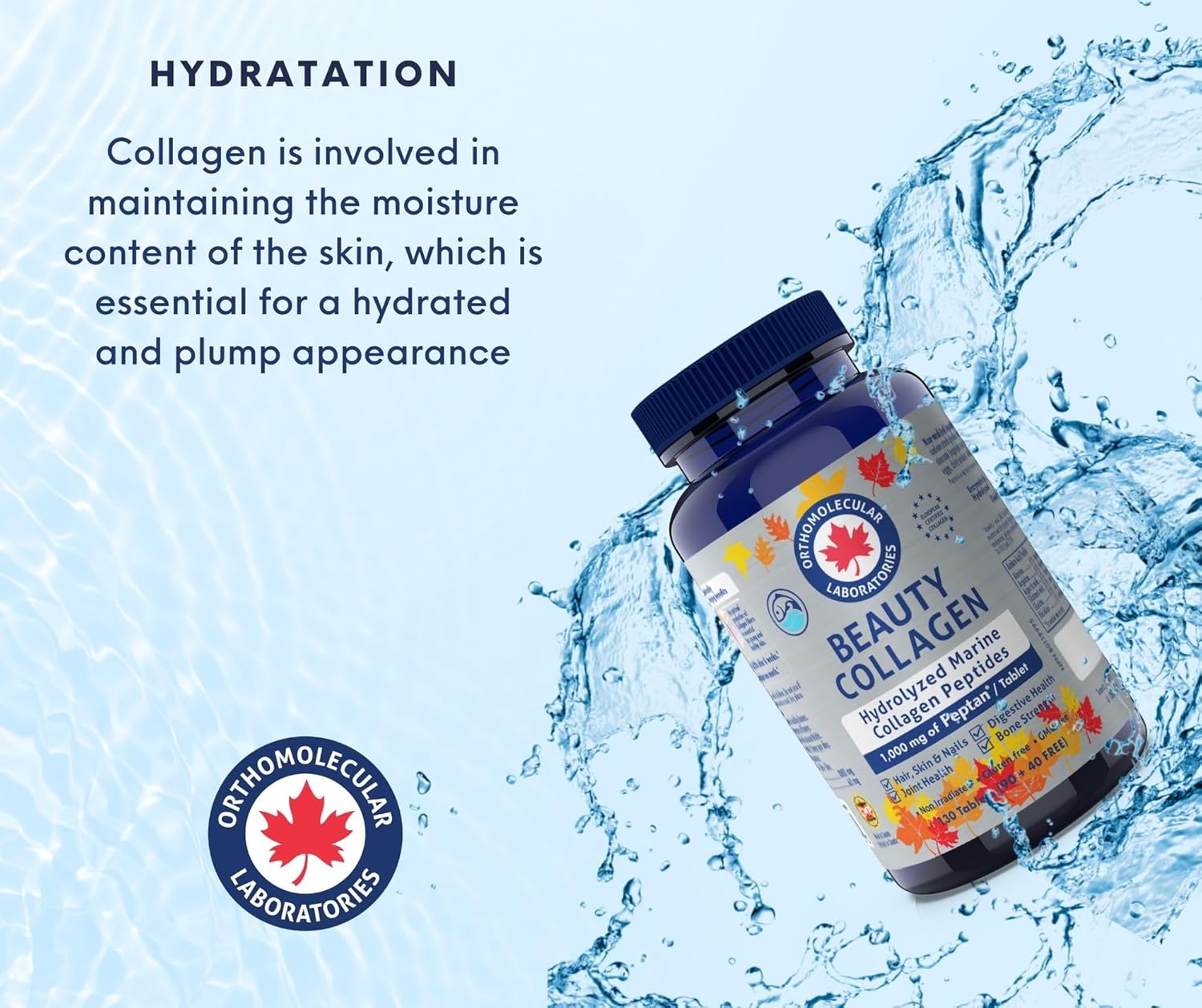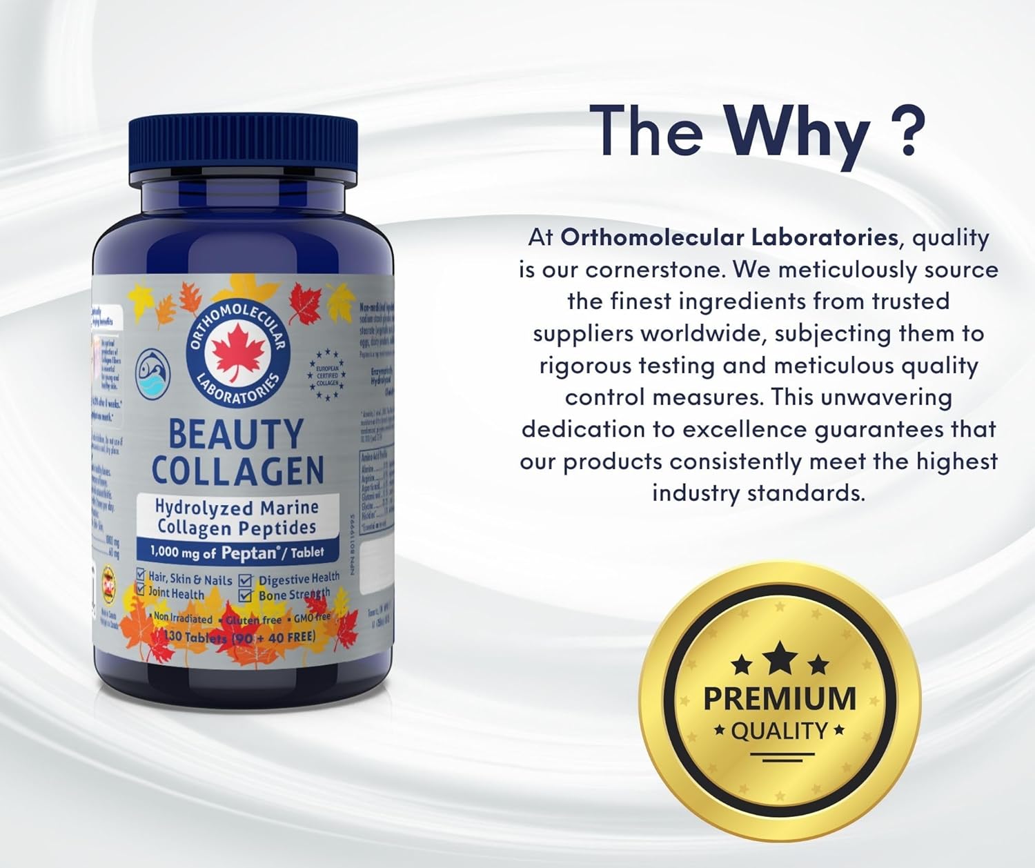 Orthomolecular Laboratories - Beauty Collagen Hydrolyzed Marine Collagen Peptides 1000mg, 130 Tablets 32-Day Supply - Vitamins for Bone Strength, Digestive Health, Joint Health, Hair, Skin and Nails