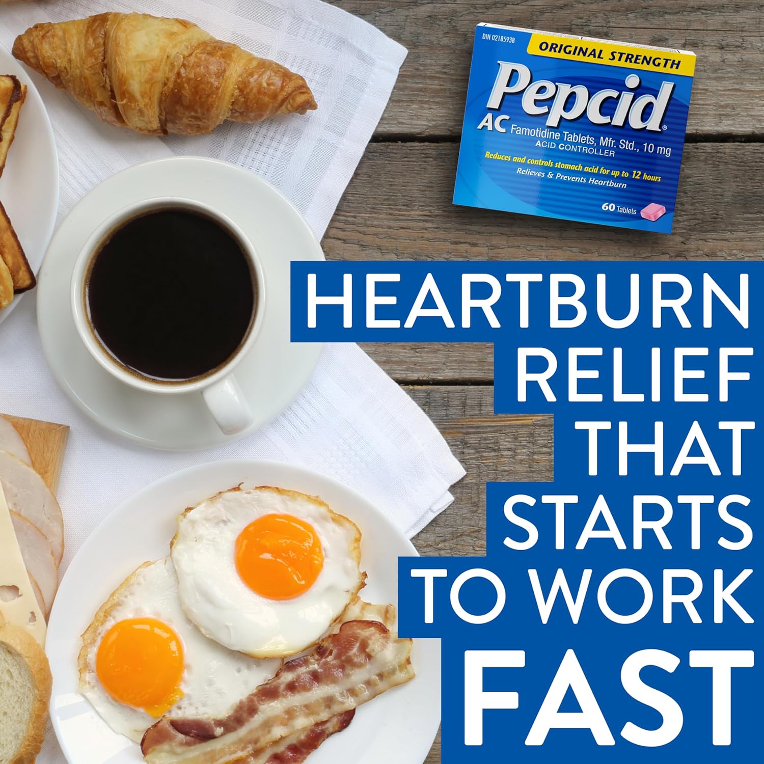 Pepcid Acid Controller Original Strength Tablets, 60 Count, work to prevent or relieve heartburn and acid indigestion. Containing the acid-reducer ingredient famotidine, these tablets control the production of excess stomach acid, preventing or relieving heartburn, acid indigestion, and upset or sour stomach brought on by eating or drinking certain food and beverages. You can take Pepcid AC to control stomach acid for up to 12 hours. Take Pepcid AC in as little as ten minutes before your first bite to prevent heartburn before it starts. Pepcid AC Tablets are easy to swallow and come in 30-count and 60-count packages.