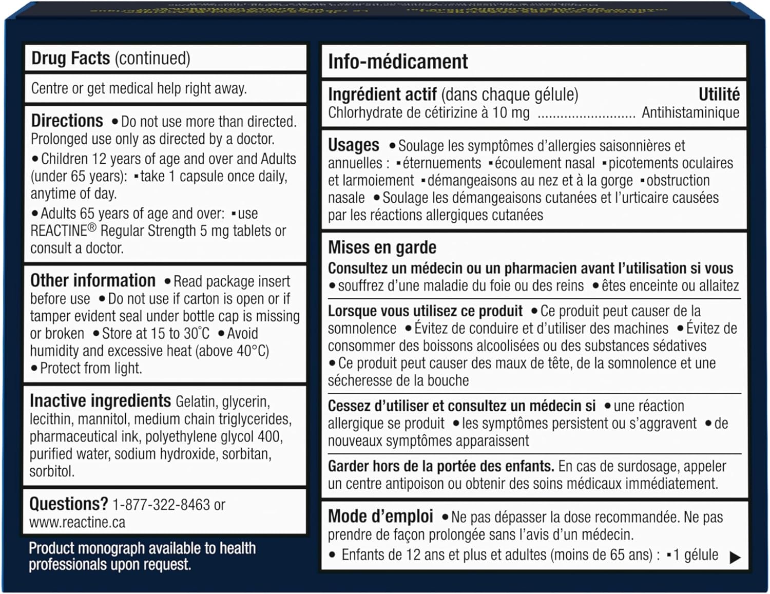 Reactine Extra Strength Allergy Liquid-Gels provides relief from itchy, watery eyes, runny nose and sneezing, stuffiness, itchy nose and throat, and allergic skin itch and hives. Reactine contains 10-milligrams of Antihistamine Cetirizine Hydrochloride. Antihistamines are your first line of defense for allergy symptom relief. Antihistamines work by blocking the sites where histamine binds. Histamine is the most abundantly released chemical and is responsible for causing most of your symptoms. Reactine provides 24-hour relief from your outdoor and indoor allergy symptoms. Understanding and recognizing the symptoms is half the battle. Allergy symptoms kick in when your immune system overreacts to substances called allergens. Indoor allergens, including mold, dust, and pet dander can cause allergy symptoms at home and at work. Since indoor allergies can be triggered any time of year, they can often be easily confused with a cold. Outdoor pollen from the spring, summer, and fall can be present inside your home too. Includes 25 liquid gels per pack. Speak to your doctor or pharmacist. To be sure this product is right for you, always read and follow the label.