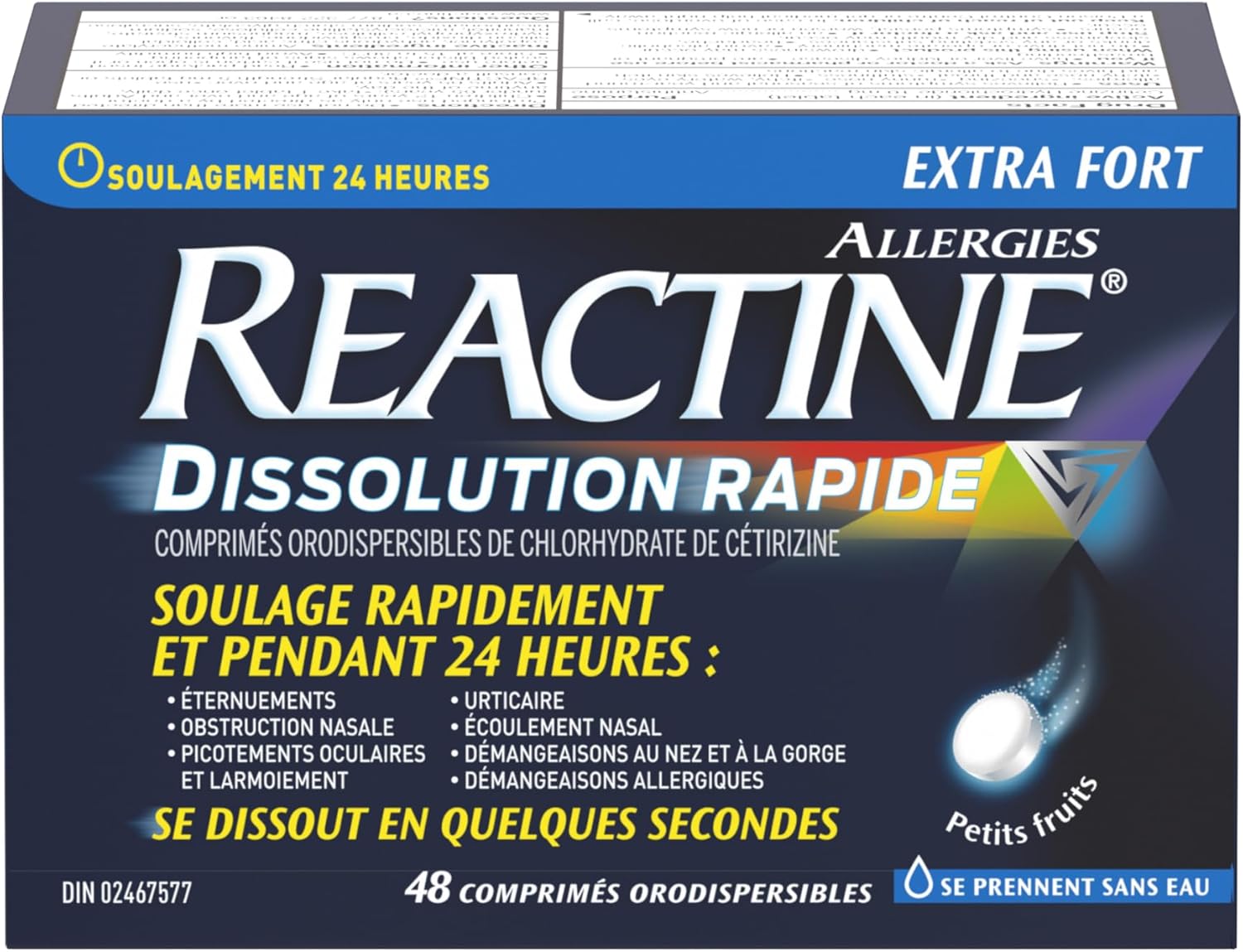 Fast allergy symptom relief with Reactine Rapid Dissolve Tablets. These extra-strength antihistamine tablets dissolve in seconds without water, delivering 10mg of cetirizine hydrochloride to combat indoor and outdoor allergens. Each tablet provides 24-hour relief from watery eyes, nasal congestion, sneezing, and allergic skin reactions. The convenient 48-count package offers an easy-to-take format, recommended for ages 12-65. *2024 IQVIA ProVoice Survey in Oral Antihistamines