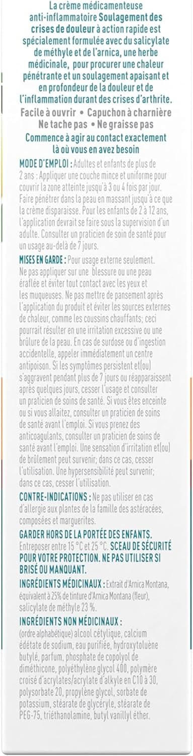 Rub-A535 Arthritis Flare Up Relief Heat Cream quickly relieves painful arthritic flare ups, joint pain and inflammation on contact. Simply rub the heat cream onto skin for a deep-penetrating, warming sensation that soothes aches and pains. This topical analgesic is fast and effective, so you can spend less time in pain and more time enjoying life. Easily apply Rub-A535 whenever pain strikes; it features an easy-open flip cap, conveniently fits in your bag and can be applied on the go. Proudly manufactured in Montreal, Quebec, Canada, RUB-A535 has been helping Canadians manage their pain for over 90 years. Whatever your pain, we have a RUB-A535 for you. Warnings: For external use only. Do not apply to wounds or damaged skin and avoid contact with eyes and mucous membranes. Do not bandage after application and avoid external sources of heat, such as heating pads, as this may result in excessive skin irritation or skin burn. If overdose or accidental ingestion occurs, call a Poison Control Centre immediately. If symptoms persist and/or worsen after 7 days or re-occur within a few days, discontinue use and consult a health care practitioner. If you are pregnant or breastfeeding, consult a healthcare practitioner prior to use. If you are taking anticoagulant medications, consult a healthcare practitioner prior to use. Rashes and/or burning discomfort have been known to occur; in which case, discontinue use. Hypersensitivity has been known to occur; in which case, discontinue use.