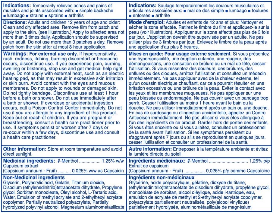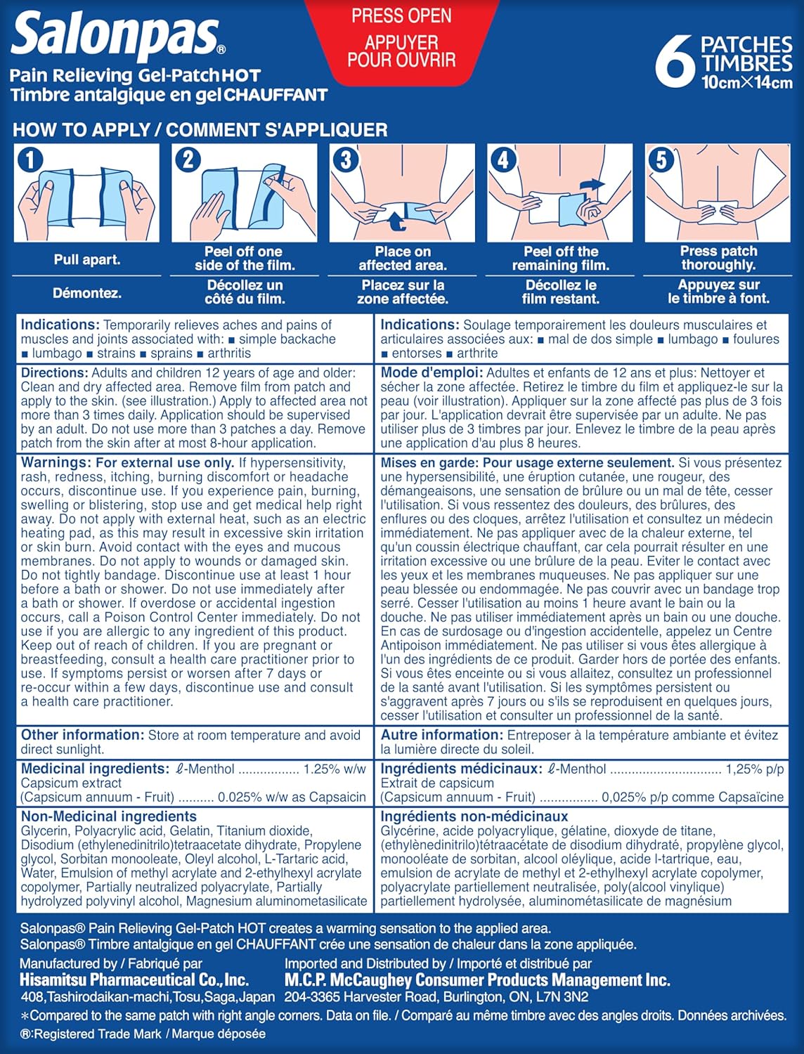Gel-patch technology designed to soothe your pain. Salonpas pain relieving gel-patch hot contains two powerful pain fighting ingredients. Menthol starts to cool on contact, while capsaicin (derived from chili peppers), creates a warming sensation. Dual action gel-patch now with improved adhesion. The rounded corners prevent peeling and the split film in the center allows for easy application