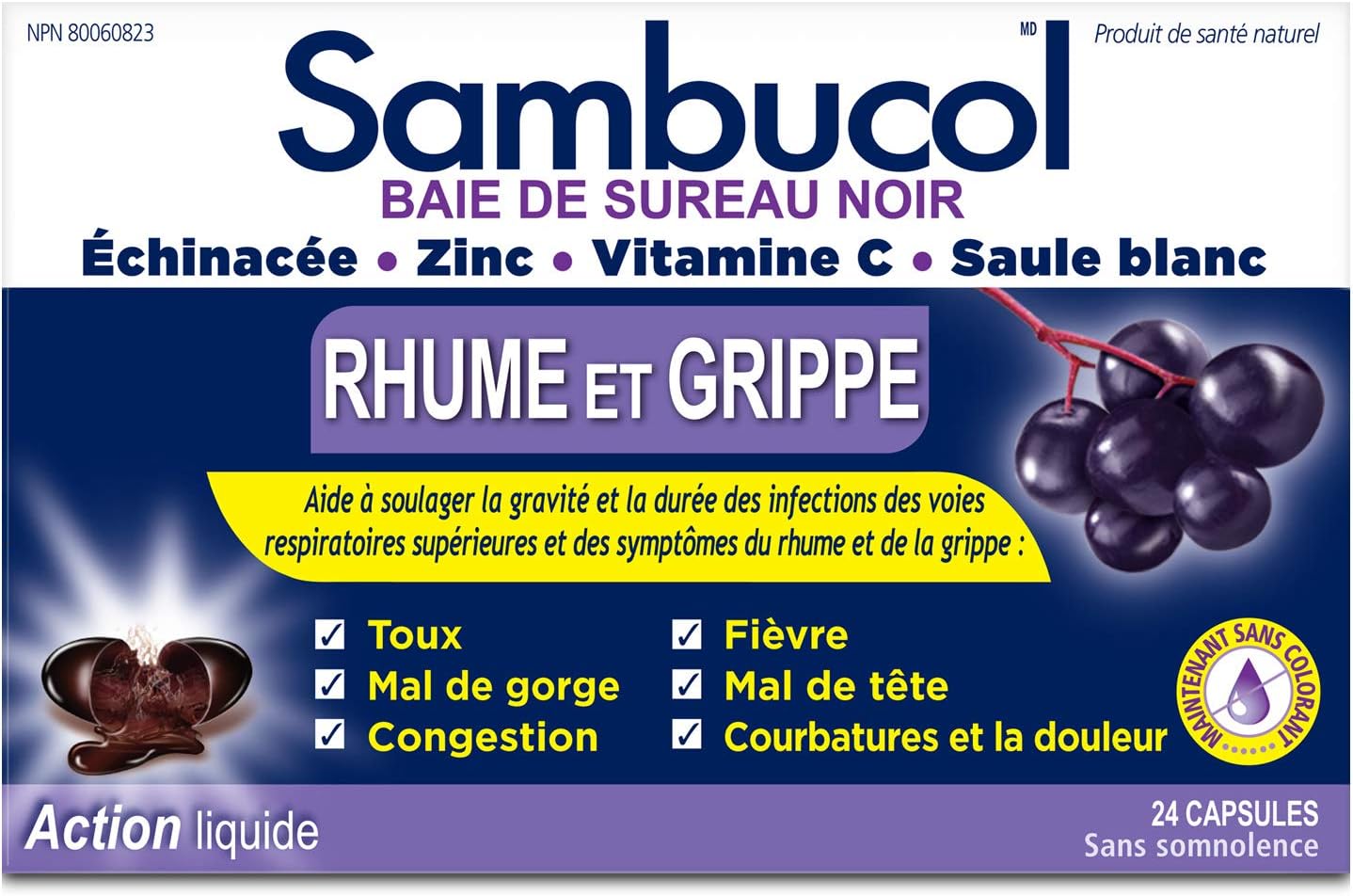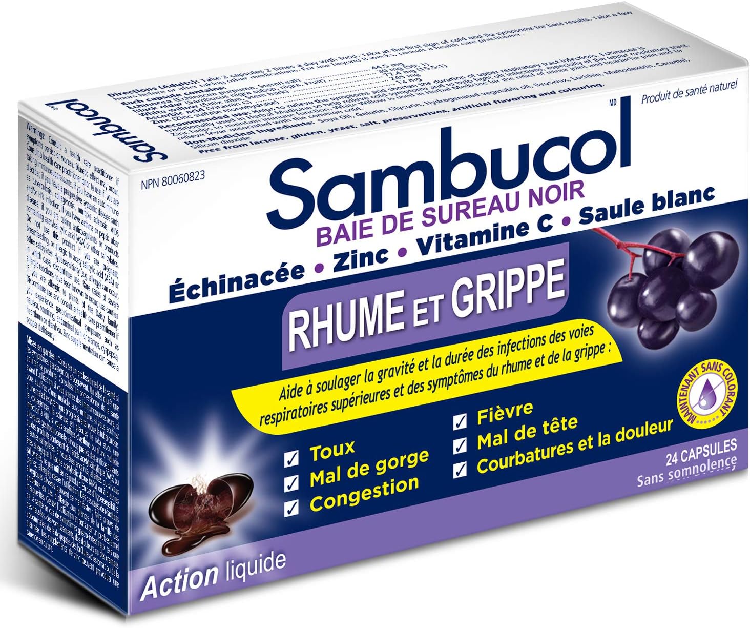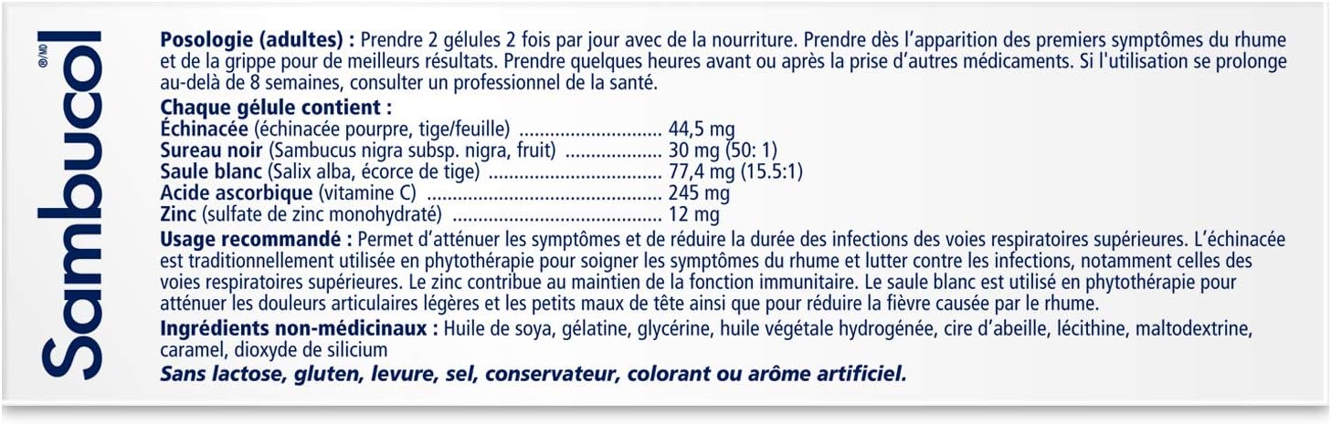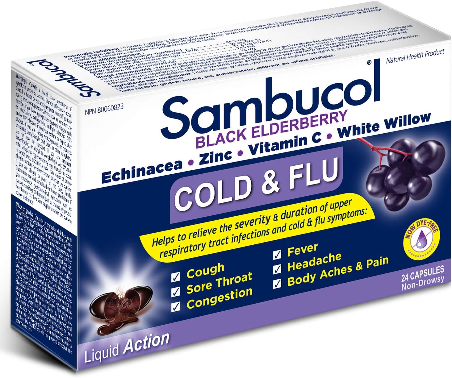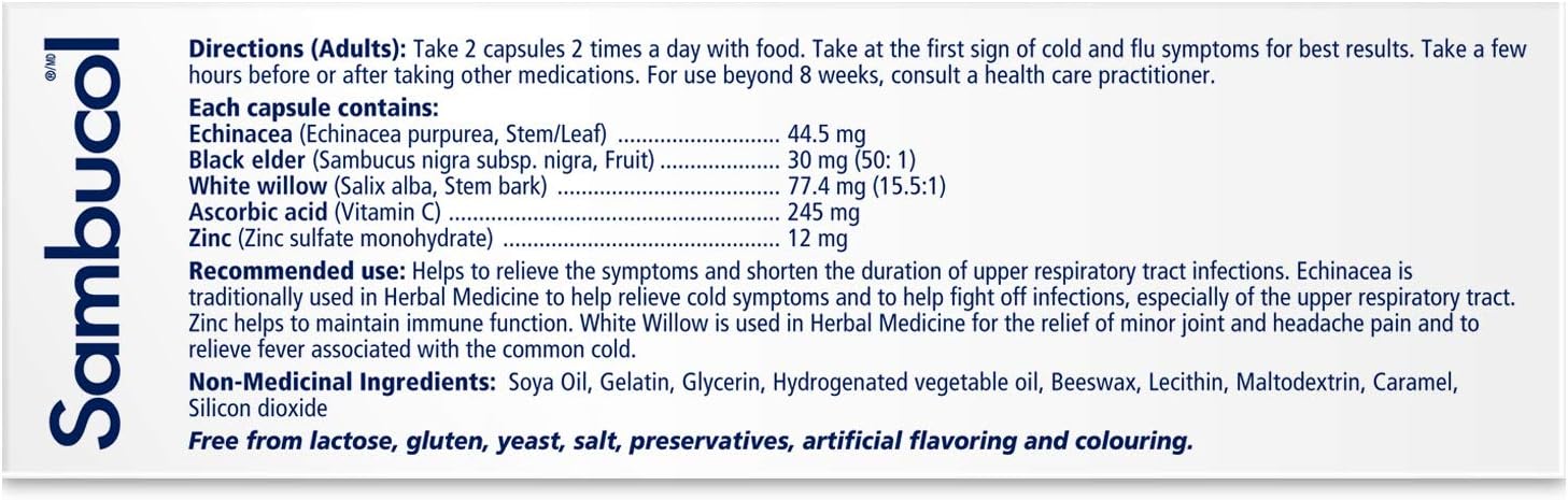 Sambucol Black Elderberry – Cold & Flu Relief | Echinacea, Zinc, Vitamin C & White Willow | Helps Relieve Congestion, Sore Throat, Coughs & Fatigue | Natural Health Product, For Adults | 24 Capsules
