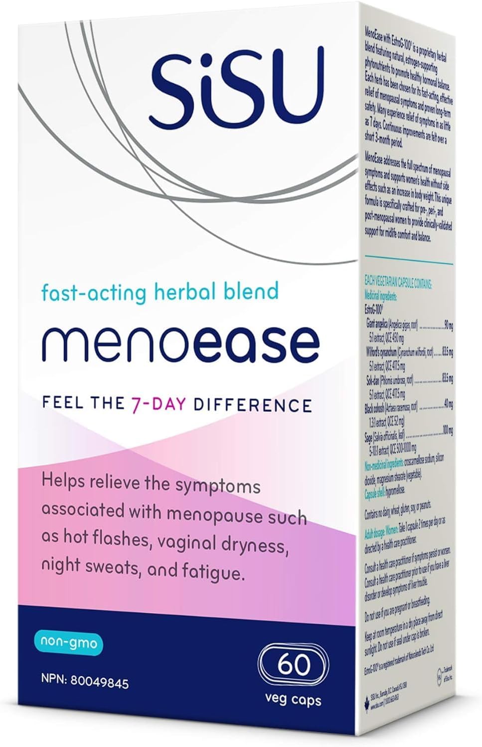 SISU MenoEase contains a proprietary herbal blend featuring natural, estrogen-supporting phytonutrients that attempts to promote healthy hormonal balance.* Each herb has been chosen for its fast-acting, potential relief of menopausal symptoms.* MenoEase attempts to address the full spectrum of menopausal symptoms and supports women’s health without side effects such as an increase in body weight.* This unique formula is specifically crafted for pre-, peri-, and post-menopausal women to possibly provide support for midlife comfort and balance.*