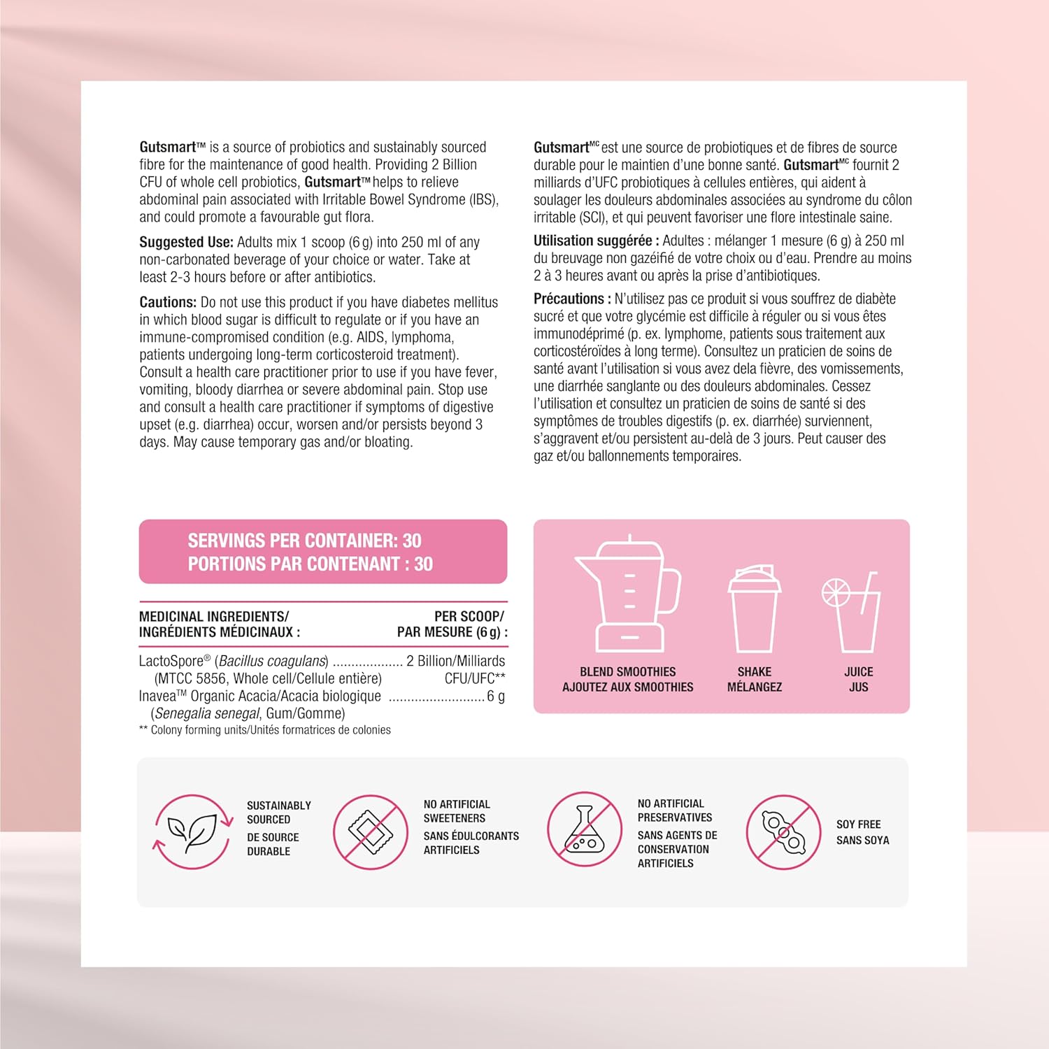 Smart solutions gut smart helps to support a favorable gut flora and provide relief from abdominal pain associated with irritable bowel syndrome (IBS). each scoop of this powder provides a source of fibre and 2 billion CFU of whole cell probiotics to stimulate the growth of healthy gut and intestinal bacteria, such as Bifidobacterium. The unflavored powdered format makes gut smart easy to take by simply adding 1 scoop to your morning smoothie, water, or any uncarbonated beverage!.