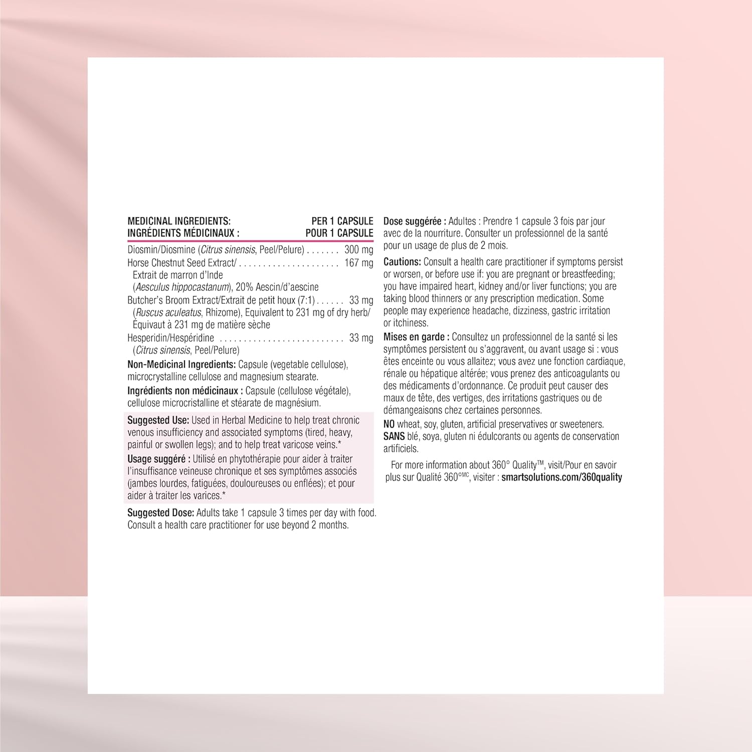 Veinsmart helps promote healthy veins by reducing the negative symptoms of varicose veins, edema and hemorrhoids. The active ingredients in Veinsmart are diosmin, hesperidin, horse chestnut extract and butcher's broom. Diosmin and hesperidin are anti-inflammatories that help relieve CVI, hemorrhoids and varicose veins. Horse Chestnut Extract and Butcher's Broom help reduce leg pain, inflammation and swelling, and symptoms of varicose veins.