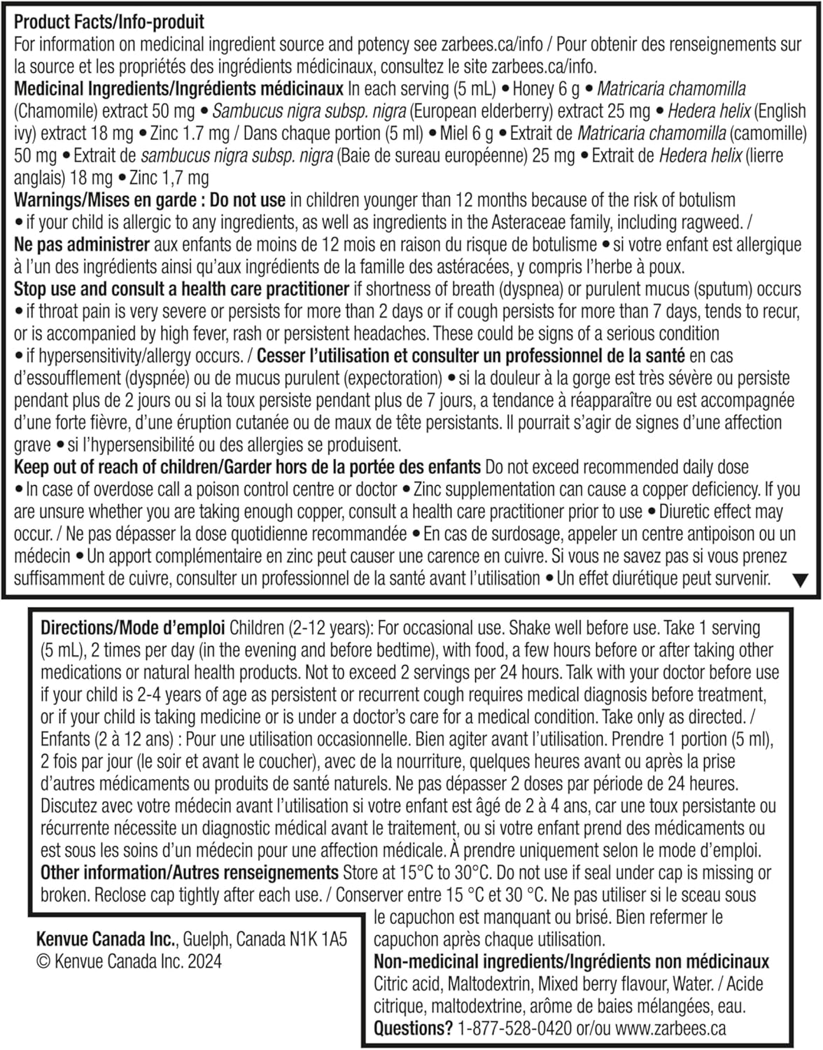Help soothe your child’s nighttime cough with Zarbee’s® Children's Nighttime Cough + Mucus Syrup. This specially formulated cough syrup is designed for children aged 2 to 12 years old and made with effective medicinal ingredients that are purposefully selected and supported by science, including Honey, Chamomile, Zinc, Elderberry, and English Ivy leaf. Contains 118 millilitres of mixed berry flavoured Children’s Nighttime Cough + Mucus Syrup. Honey helps soothe coughs associated with dry and irritated throats, whileChamomile is used in Herbal Medicine to help relieve restlessness and nervousness. This formula also contains English Ivy leaf which helps clear mucus while coughing, Zinc which helps support the immune system, and Elderberry which serves as a source of antioxidants. Zarbee’s® Children's Nighttime Cough + Mucus Syrup is made with effective medicinal ingredients backed by science and is free of alcohol, dyes, artificial sweeteners and artificial flavours. Recommended dosage for children (2-12 years): Take 1 tsp. (5 mL) in the evening and before bed. Take as needed, and do not exceed 2 doses per 24 hours. Talk with your doctor before use if your child is taking medicine or is under a doctor’s care for a medical condition. For occasional use. Shake well before use. This product comes in a 118-millilitre bottle and includes a yellow dosing cup to make giving Zarbee’s® mess-free for little bees to big bees. To be sure any Zarbee’s® product is right for your child, always read and follow the label.