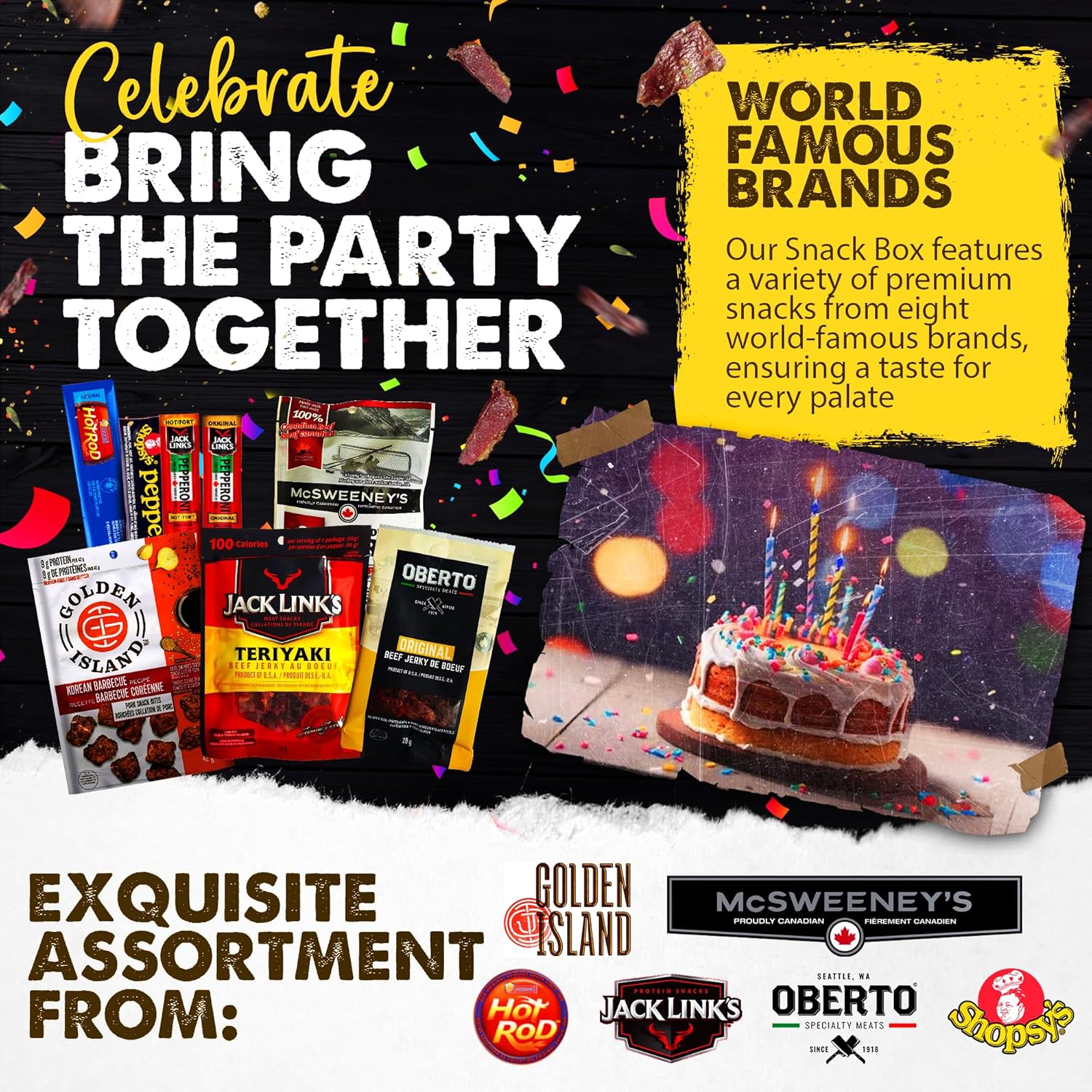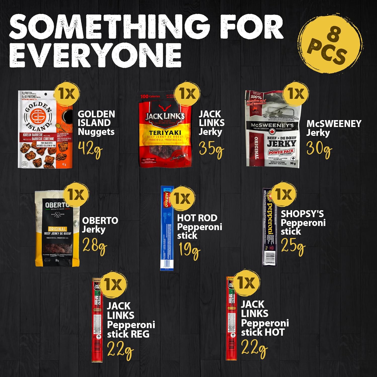 Fathers Day Meat box includes: Snack box of Mcsweeneys beef jerky, Jack Links beef jerky snack packs, Orberto and Golden Island snack bites. Hot Rods pepperoni sticks with Jack Links and Shopsy's, discover unique flavors with our exotic jerky Canadian gift basket.Bulk snacks personalized gift message: Personalized messages are also available to share your gifts customized sentiments for every situation that can arise. This heart-warming option has been included to allow you to share your custom created message with your gift recipient.Birthday gift ideas: Beef Jerky birthday gifts for him or her, Valentines gift set for men or women; perfect gifts for any special occasion including, anniversary, wedding, engagement, Christmas, graduation, unique father's day gifts , mothers day and are great for corporate gifts as well.Bulk beef jerky pepperette: Panier cadeau homme for the ultimate snacking experience, our generous food basket gifts of high-quality beef jerky is the ideal Valentines gift for men who love their meat snacks, and perfect valentine's gifts for dad.Shelf stable: Looking for the perfect gifts for outdoorsman who love hiking and camping? Look no further than our hiking gift basket, filled with delicious exotic meat snacks that make the perfect hiking food and backpacking food. Packed with protein and flavor, our camping snacks are sure to satisfy any adventurer's hunger on the trail.Cadeau Homme: Indulge in a curated selection of healthy snacks for adults, perfect as a thoughtful mens gifts or for stocking up on bulk snacks like beef jerky, meat sticks, and gift baskets for family gatherings.Snacks for adults: looking for mens birthday gift ideas ? Our birthday gifts for men will be sure to please.Depending on availability, jerky may be replaced with another brand of equal or greater valueSize: 8 Piece Set. Specialty: Snack. Unit count: 1.00 Count. Manufacturer: APPETIZE Gourmet Crates. Appropriate Age Range: Adult. Package Information: Box. Parcel Dimensions: 25.8 x 17.6 x 7.7 cm; 400 g. Ingredients: Beef jerky, Pepperoni sticks. Occasion: Birthday, Congratulations, Easter, Father's Day, Valentine's Day. Item Weight: 400 g. ASIN: B0CHLQ9RQZ. Customer Reviews: 3.6 3.6 out of 5 stars 275 ratings 3.6 out of 5 stars. Best Sellers Rank: #4,991 in Grocery & Gourmet Food (See Top 100 in Grocery & Gourmet Food)#25 in Jerky. Date First Available: Sept. 9 2023.