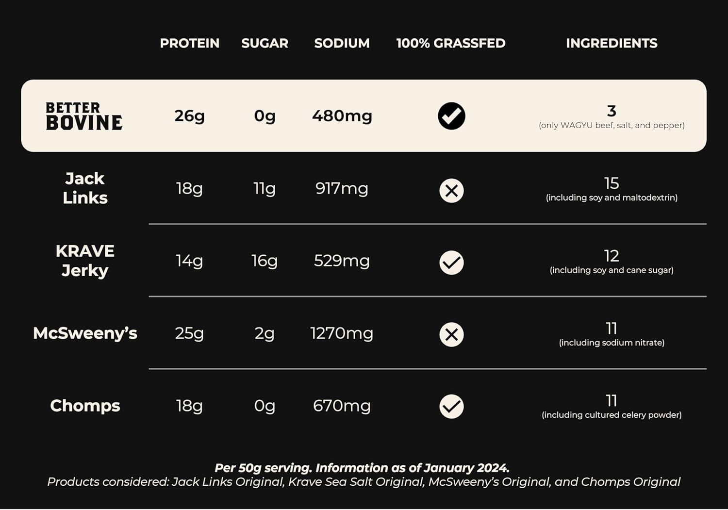 CLEAN & HEALTHY ON-THE-GO SNACK - Only 3 ingredients (beef, salt, and pepper), 26g of protein, no carbs, and no sugar.DIET APPROVED - Our beef jerky is Gluten-free, Keto, Paleo, Carnivore, Low Carb, No Carb, Low FODMAP, Whole30, Diabetic, and Non-GMO friendly.ALLERGEN FRIENDLY - All natural, whole food ingredients that are dairy free, soy free, nut free, gluten free, nitrate free, msg free, and sugar free.QUALITY & SUSTAINABLE PROTEIN - Our beef is 100% grass fed and grass finished, Certified Humane, Non-GMO Project Verified, and raised regeneratively without antibiotics or added hormones.DELICIOUS TASTE - Mouthwatering wagyu flank steak, slowly dehydrated and rendered to perfection, creating an easy-to-chew and melt-in-your-mouth experienceCuisine: Japanese cuisine. Special Feature: 100% Grass-fed Beef (Raised Regeneratively and Humanely), Free From Top 9 Allergens, No Harmful Additives (No Nitrates, No Celery Salts, No Yeast, No B.S.), Non-GMO, Rich in Protein (26g of protein per pack). Brand: Better Bovine. Form: Strip. Appropriate Age Range: Adults. Serving recommendation: 50. Package Information: Bag. Manufacturer: Better Bovine. Allergen information: Contains: Allergen-Free. Units: 250.0 Grams. Product Dimensions: 10 x 16 x 1 cm; 300 g. Ingredients: 100% Grass Fed and Grass Finished Wagyu Beef + Salt + Pepper. Serving size: 50 g, 50 milligrams. Energy (kcal): 43.02 Kilocalories. Protein: 26 g. Fat: 9 g. Carbohydrate: 0 g. - Sugars: 0 g. Item Weight: 300 g. ASIN: B0C59J9T6D. Customer Reviews: 4.0 4.0 out of 5 stars 51 ratings 4.0 out of 5 stars. Best Sellers Rank: #5,397 in Grocery & Gourmet Food (See Top 100 in Grocery & Gourmet Food)#27 in Jerky. Date First Available: April 3 2023.