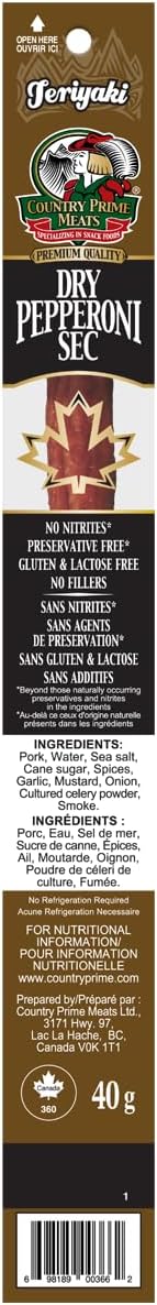 High Protein Snack: With 7 grams of protein, our Teriyaki Pepperoni Sticks keep you energized and satisfied. Whether you're at work, on a hike, or hitting the gym, this savoury snack is your perfect partner for staying full and focused!.Snacking Made Simple and Convenient: No refrigeration? No problem! Our individually wrapped meat sticks are air-dried to ensure the optimal moisture level for an 18-month shelf life with no refrigeration required, so they are ready when you are. Perfect for road trips, lunchboxes, or a quick bite at your desk. They're the perfect snacks for adults and kids alike! Snacking has never been this easy or delicious!.Keto Friendly Sweet & Savoury Goodness: Craving a sweet and savory snack that fits your lifestyle? Our Teriyaki Pepperoni Sticks deliver delicious flavor and make a perfect guilt-free choice for anyone watching their macros, following a carnivore diet, or living a keto lifestyle..Naturally Real Ingredients: Country Prime Meats provides wholesome, naturally smoked, preservative-free, high protein snacks made with local, natural ingredients and humanly raised meat. Our products have no additives, hormones, fillers, MSG, artificial colours or flavours. Plus, they are gluten and lactose free to support a variety of dietary needs..Proudly Canadian Made: Country Prime Meats products are 100% made in Canada with humanly raised meat from local producers to create premium products that support Canadian small businesses all the way from the farm to your home. Try Country Prime Meats today and show your support for Canadian-made products!Special Feature: No Artificial Flavours. Brand: Country Prime Meats. Region produced in: Canada. Form: Stick. Manufacturer: Country Prime Meats. Allergen information: Contains: Gluten Free, Lactose Free, Preservative-Free, Soy Free. Units: 1000 Grams. Parcel Dimensions: 30.9 x 11.4 x 10.9 cm; 1.19 kg. Ingredients: Pork, Water, Sea salt, Cane sugar, Spices, Garlic, Mustard, Onion, Cultured Celery Powder, Smoke. Porc, Eau, Sel de mer, Sucre de canne, Épices, Ail, Moutarde, Oignon, Poudre de céleri de culture, Fumée.. Item Weight: 1.19 kg. ASIN: B0DSLXQKFZ. Customer Reviews: 3.7 3.7 out of 5 stars 19 ratings 3.7 out of 5 stars. Best Sellers Rank: #1,936 in Grocery & Gourmet Food (See Top 100 in Grocery & Gourmet Food)#5 in Jerky. Date First Available: Jan. 9 2025.
