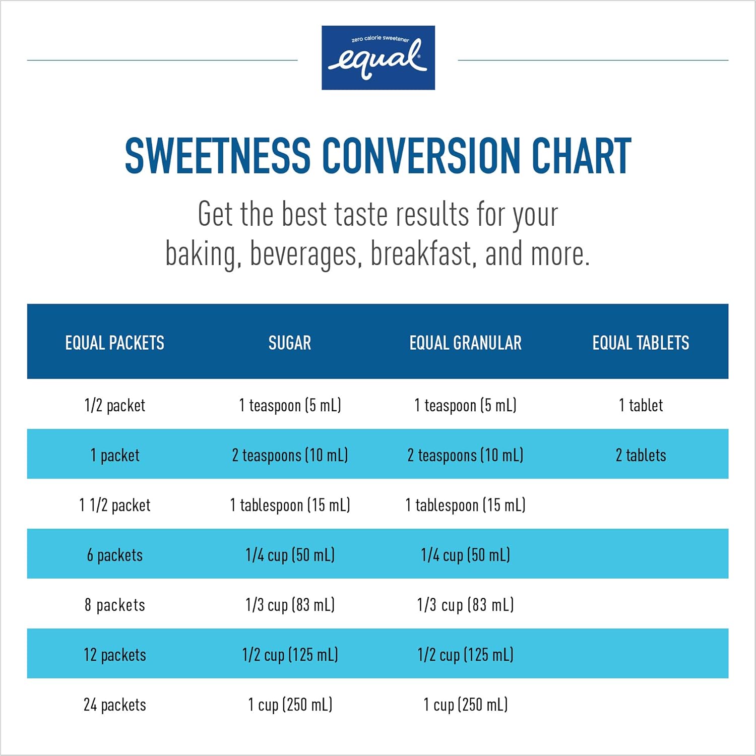 EQUAL 0 calorie sweetener packets are perfect for coffee, iced tea and other drinks. The zero-calorie sweetener you know and love dissolves quickly in hot or cold beverages, adding sweetness to every sip. EQUAL 0 calorie sweetener products can be useful in a diet of individuals with diabetes. Sugar substitutes, such as EQUAL, can be used to sweeten foods and drinks with less calories and carbohydrates when they replace table sugar. One serving of EQUAL contains 0 calories and less than one gram of carbohydrate. Those with diabetes or concerned about glucose levels should consider the impact on their diet of other ingredients used in foods sweetened with EQUAL. A food or beverage containing EQUAL 0 calorie sweetener may still have calories and carbohydrates, so always check the Nutrition Facts panel or other sources.