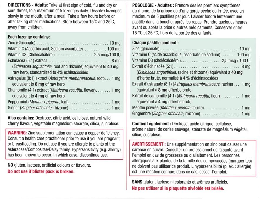 Jamieson Zinc Lozenges provide support for your immune systems. These lozenges contain a highly bioavailable formula of zinc citrate, vitamin C, vitamin D3 and echinacea. These nutrients work together to enhance your body's immune system and support the maintenance of optimal health. The lozenges quickly dissolve so your body can absorb the active ingredients for quick relief from cold and flu symptoms.
