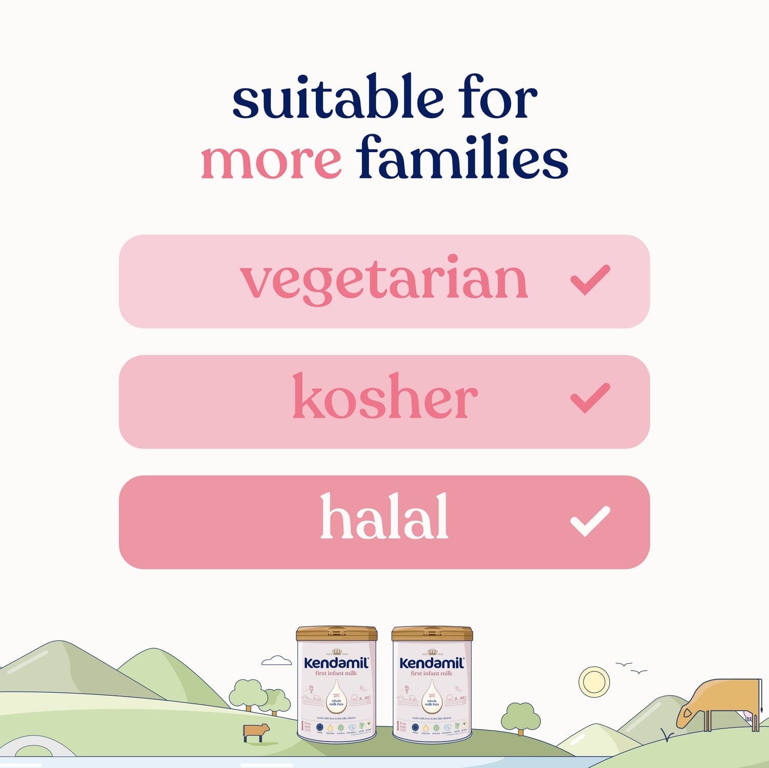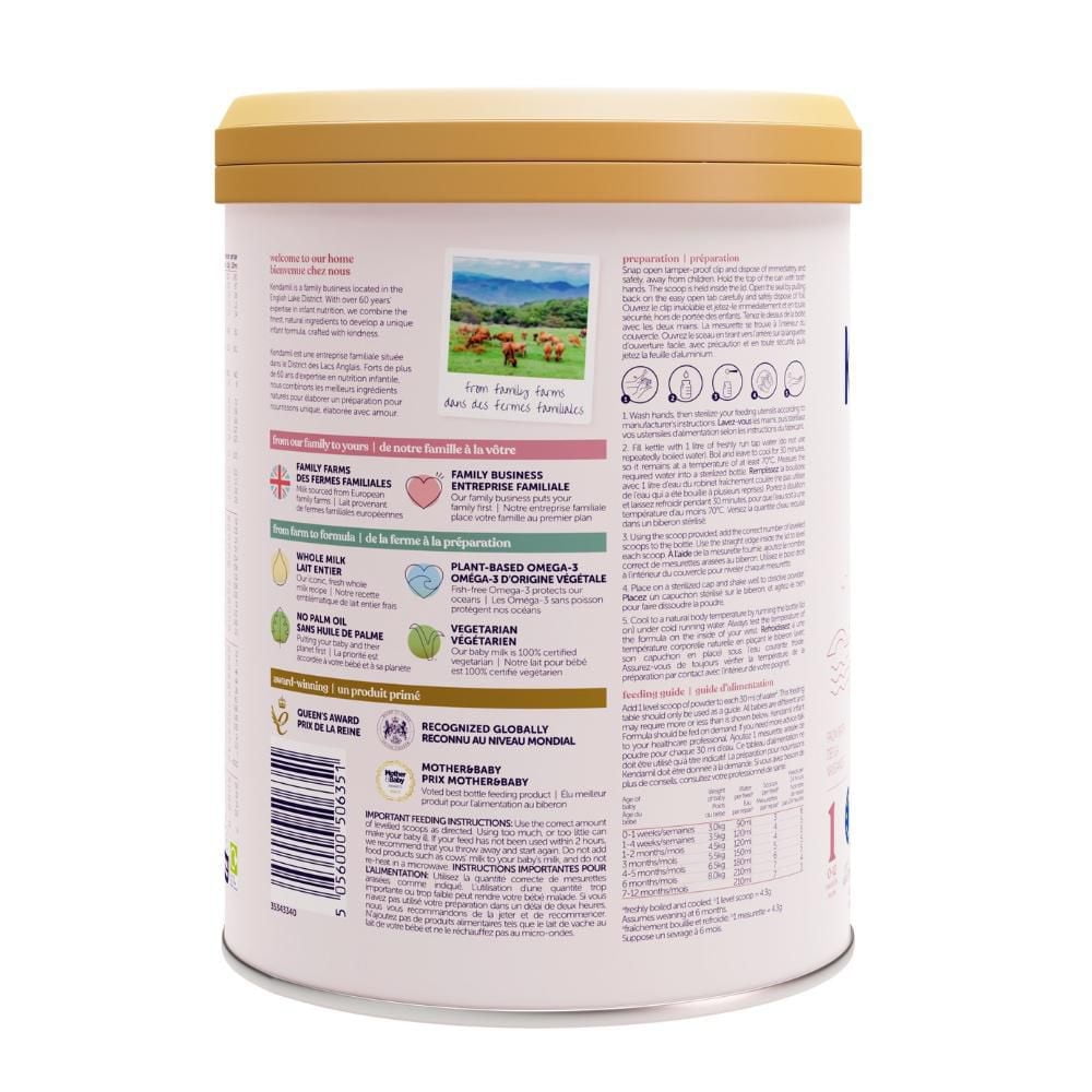 Hi, we’re Kendamil - proudly family-owned and crafted in Europe since 1962. For over 60 years, our family has been dedicated to raising the standard of infant formula with our signature whole milk recipe. Kendamil infant formula combines only the finest quality and sustainably sourced ingredients, starting with natural whole milk fats (present with MFGM identified in breast milk and shown to support cognitive development) and lactose from grass-fed cows - replacing palm oil, soy, and corn syrups while creating a naturally creamy formula closer to breast milk and wholesome by nature. Kendamil infant formula is enriched with a unique prebiotic blend of HMOs, GOS & FOS to help support a healthy immune system. It also includes plant-based DHA (Omega-3) and ARA (Omega-6) for brain and vision development. Our award-winning formulas meet the highest standards for infant formula set forth by Europe and the United States, guaranteeing exceptional quality for your family. Certified: Vegetarian, Kosher, and Halal MFGM: Milk Fat Globule Membrane HMO: Human Milk Oligosaccharides (3’-GL, 4’-GL, 6’-GL)