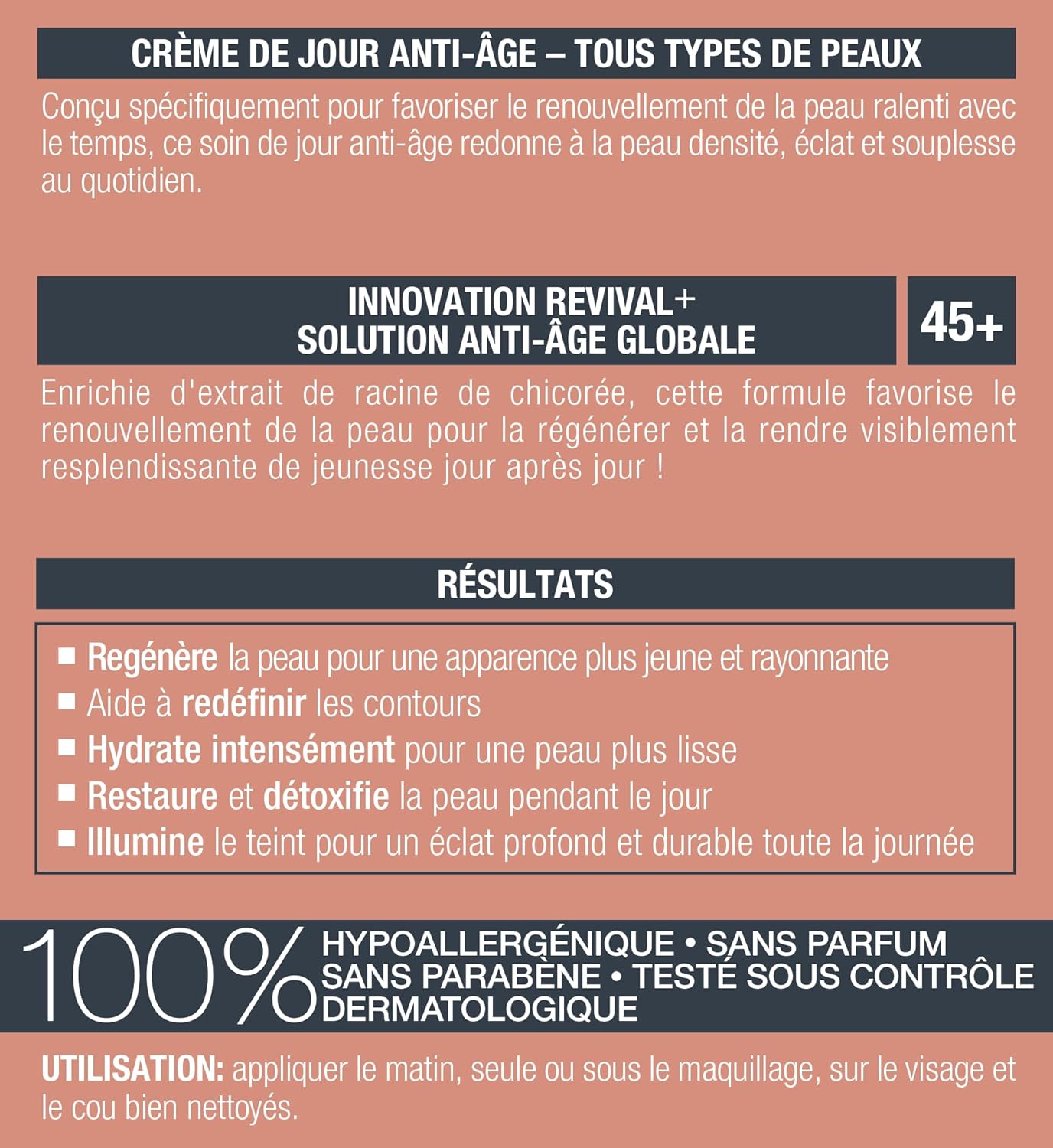 Specifically formulated to promote skin renewal, this anti-aging day cream restores skin density, suppleness and youthful radiance. Enriched with chicory root extract, this advanced formula promotes skin renewal by regenerating skin cells to make your complexion visibly more radiant with a beautiful, youthful glow day after day! This anti-aging day cream is cruelty free, hypoallergenic, paraben free, fragrance free and oil free. Apply in the morning to well-cleansed skin, alone or before applying makeup.