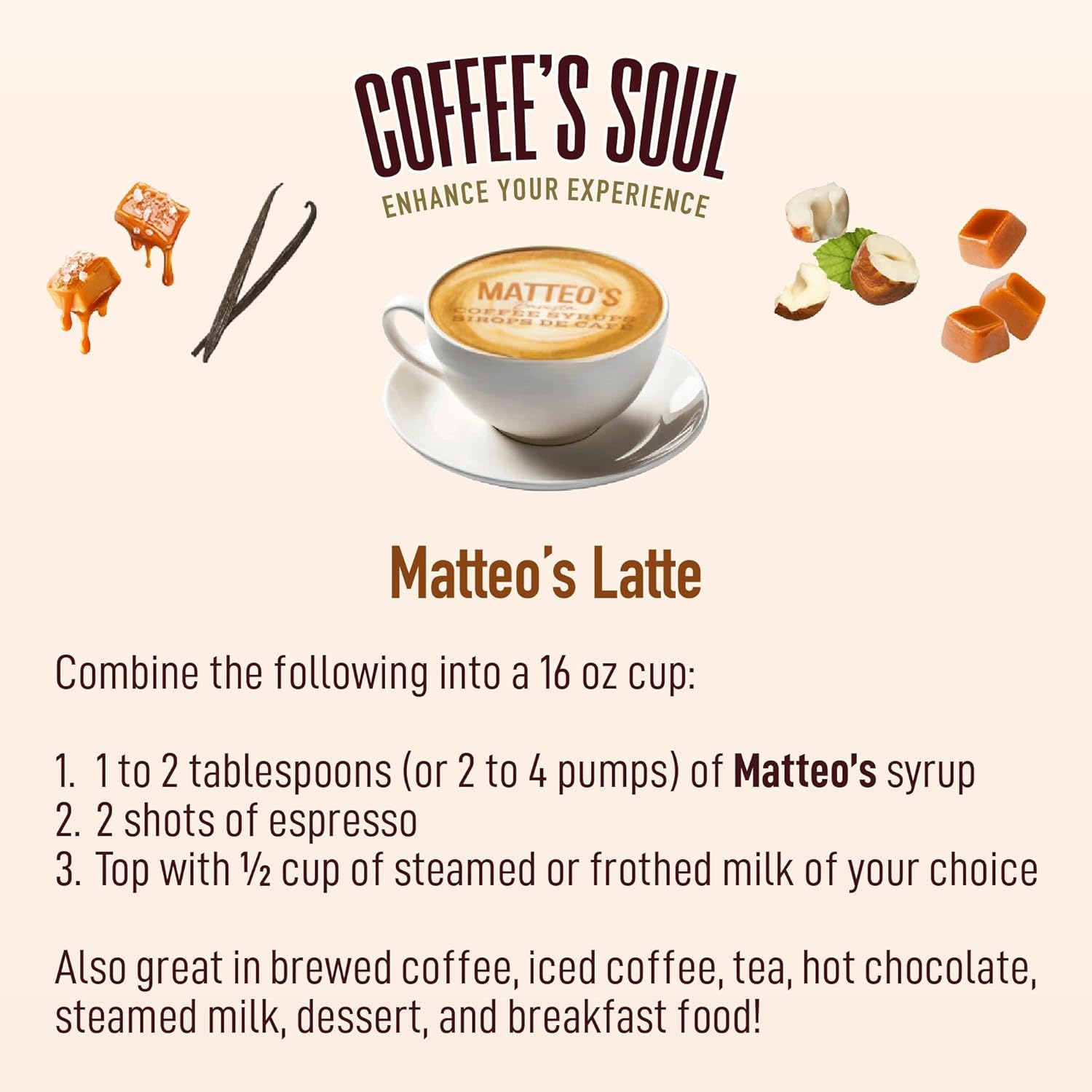 Introducing Matteo's, Coffee's Soul Matteo's is a barista inspired line of coffee favorites extending beyond the bean. Our lineup includes most notably our famous Sugar Free Coffee Syrups. Bring your favorite coffee shop experience home or to work with our coffee syrup variety pack that includes our french vanilla syrup, our mocha syrup for coffee, our sugar free cinnamon dolce syrup for coffee or our most popular salted caramel syrup and caramel coffee syrup! Stir in a small amount of Matteo's to completely transform your coffee experience. You'll experience a warm, cafe inspired aroma and flavour that will transform how you enjoy your cup of joe, whether it's first thing in the morning, or during your afternoon break! We you will enjoy our flavoured syrup. If you've never tried our syrups for coffee drinks, we recommend that you give it a try, it will totally transform how you have been enjoying coffee at home. Also, try it in various recipes, including home made caramel iced coffee in those warm summer months Rest assured, Matteo's comes packaged in a plastic bottle (to avoid leaks and damages) in transit.