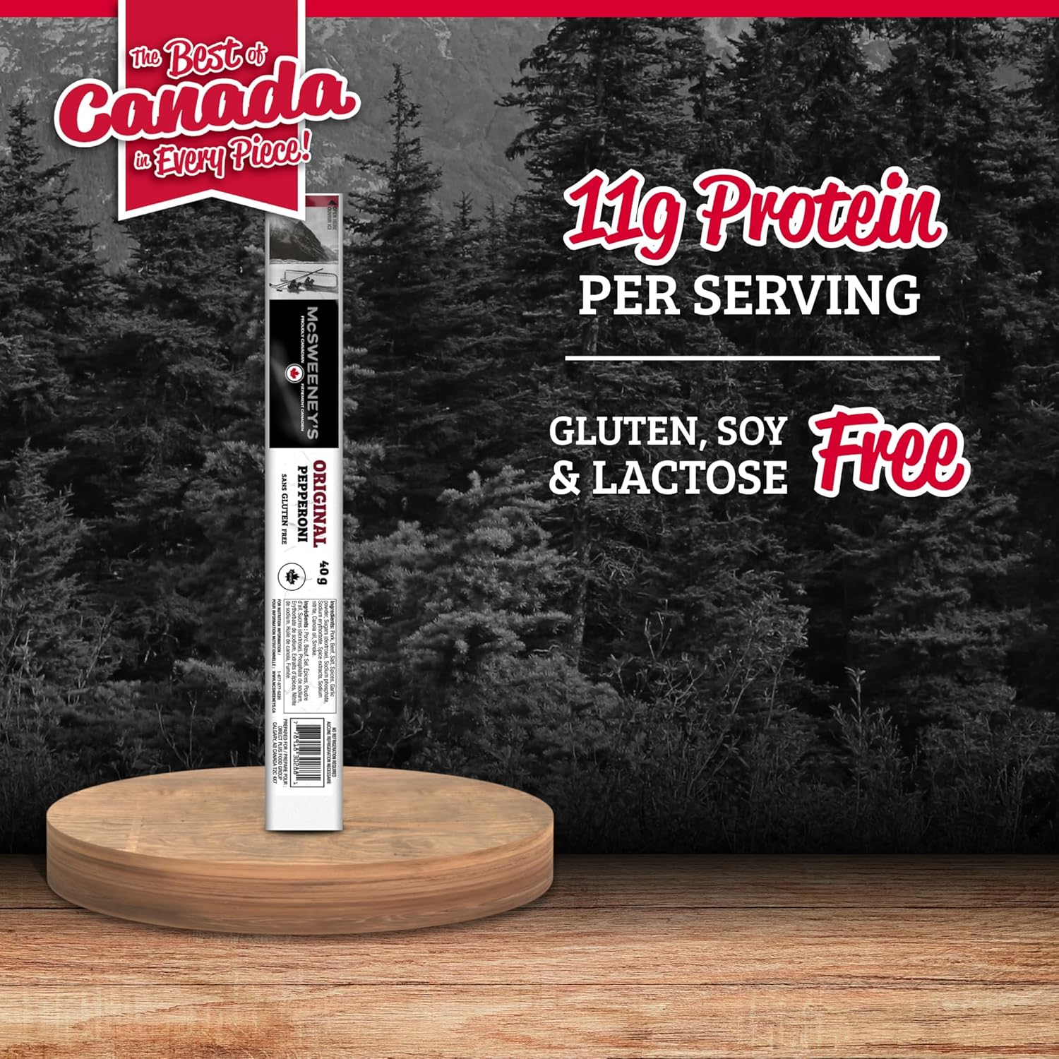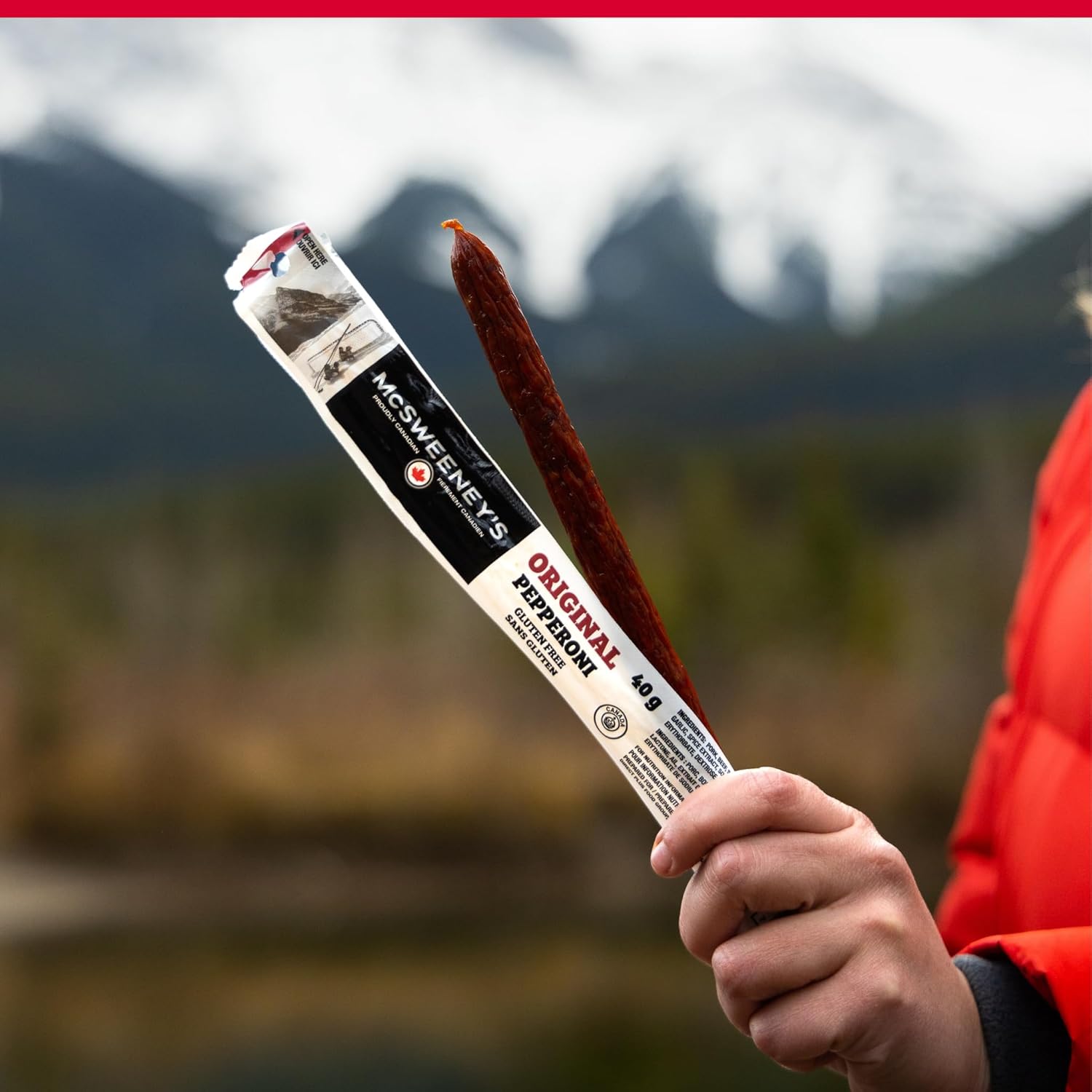 Convenient Bulk Snacks: If you love pepperoni, you have to try our original pepperoni sticks. Each caddy contains 20 individually wrapped ready to eat 40 gram sticks made with premium Canadian pork and beef. With no refrigeration required, these shelf-stable snacks are perfect for enjoying outdoors on the go, at the office for an afternoon snack or in the car on a long road trip..High Protein Meat Sticks : Our original flavour, pepperoni, is mildly spiced and packs 16 grams of protein per serving, making it the perfect portable snack to eat while hiking, biking, camping or after a hard workout..Tasty Anytime Snack: Satisfy your cravings with our bold and flavorful pepperoni sticks. Packed with delicious taste and perfect for on-the-go snacking, they’re a great choice for anyone looking for a satisfying, protein-rich option..Proud To Support Canadian Meat Producers: McSweeney's meat snacks are made with 100% Canadian beef, chicken, and turkey, produced by Canadian farmers who are committed to the strict standards of our animal health and welfare program. In doing so, we not only improve the lives of animals raised for our products, but we hope our commitment will inspire the right behaviours from other meat snack producers and the farms that supply the Canadian livestock industry..Proudly Canadian Meat Snacks: For the past 30 years, McSweeney’s has proudly provided Canadians with delicious meat snacks crafted from premium, hand-selected beef, pork, and poultry made with care in Canada.Cuisine: Pepperoni. Special Feature: Gluten Free. Brand: McSweeney's. Region produced in: Canada. Appropriate Age Range: 12 years and up. Serving recommendation: 40 grams. Package Information: Box. Manufacturer: McSweeney's. Allergen information: Contains: Gluten Free. Manufacturer reference: 30288. Units: 800 Grams. Product Dimensions: 9.1 x 7.8 x 27.9 cm; 40 g. Ingredients: Pork, Beef, Salt, Spices, Garlic powder, Sugars (dextrose), Sodium phosphate, Sodium erythorbate, Spice extracts, Sodium nitrite, Canola oil, Smoke.. Serving size: 40 g. Protein: 11 g. Fat: 18 g. Carbohydrate: 1 g. - Sugars: 0 g. Item Weight: 40 g. ASIN: B07XY2X6T6. Customer Reviews: 3.9 3.9 out of 5 stars 56 ratings 3.9 out of 5 stars. Best Sellers Rank: #2,398 in Grocery & Gourmet Food (See Top 100 in Grocery & Gourmet Food)#7 in Jerky. Date First Available: Sept. 18 2019.
