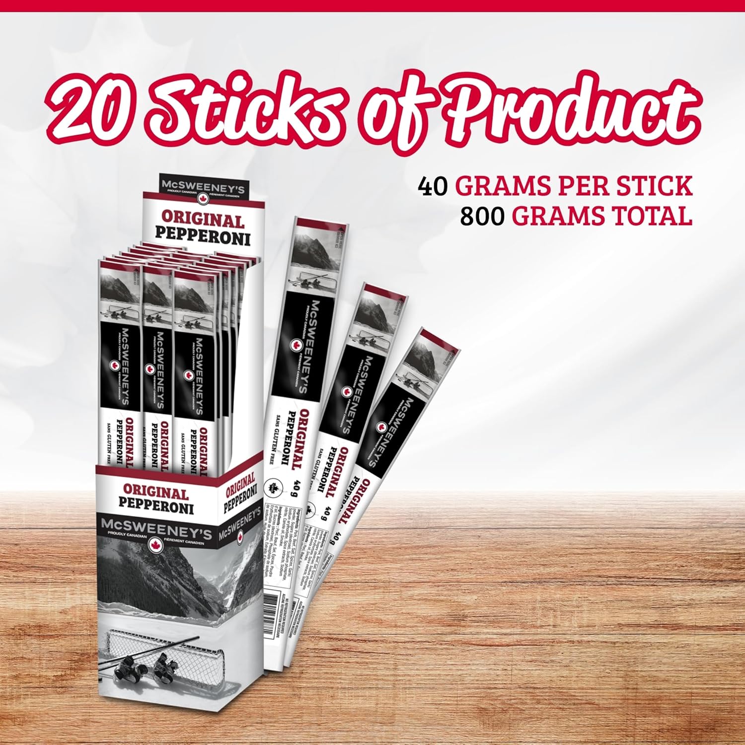 McSweeney's Original Dry Cured Pepperoni Sticks, 100% Made in Canada, Dry Cured Pepperoni, Naturally Smoked, High Protein Snacks, Gluten Free Meat Snacks, No Refrigeration Required, Bulk Case. 40g (Pack of 20)