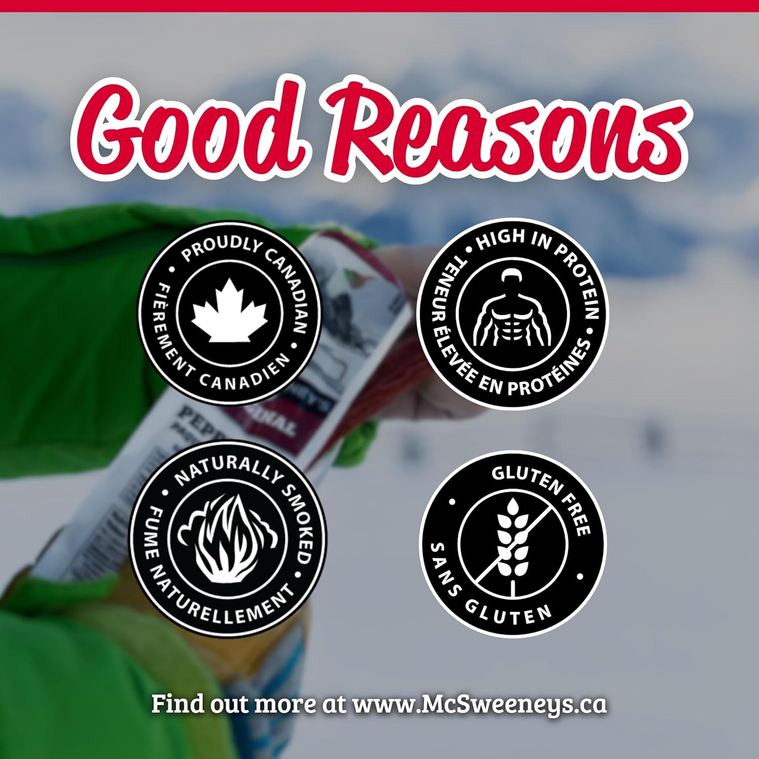 Convenient Snacking Anywhere: Our individually wrapped pepperoni sticks are naturally smoked and require no refrigeration, making them ideal for road trips, hikes, or a quick bite at your desk. Each caddy contains ten individually wrapped ready-to-eat 80 gram sticks made with premium Canadian pork and beef. They're the perfect snacks for adults and kids alike. If you love pepperoni, you have to try our original pepperoni sticks!.High Protein Snack: McSweeney's Original pepperoni stick has 11g of protien per serving to help you fuel your busy day. Whether you're hitting the gym or need a quick pick-me-up, these pepperoni sticks keep you energized and satisfied..Classic Smokehouse Flavour in Every Bite: Crafted from 100% Canadian beef and naturally smoked, McSweeney’s All Beef Sticks Original deliver a bold, savoury flavour with a smooth, satisfying finish. Lightly seasoned with a classic blend of spices, these beef sticks offer a clean, protein-rich snack experience that brings together quality ingredients and rich, smoky taste..Proud To Support Canadian Meat Producers: McSweeney's meat snacks are made with 100% Canadian beef, chicken, and turkey, produced by Canadian farmers who are committed to the strict standards of our animal health and welfare program. In doing so, we not only improve the lives of animals raised for our products, but we hope our commitment will inspire the right behaviours from other meat snack producers and the farms that supply the Canadian livestock industry..Proudly Canadian Meat Snacks: For the past 30 years, McSweeney’s has proudly provided Canadians with delicious meat snacks crafted from premium, hand-selected beef, pork, and poultry made with care in Canada.Special Feature: Gluten Free. Brand: McSweeney's. Region produced in: Canada. Serving recommendation: 40 grams. Package Information: Box. Manufacturer: McSweeney's. Allergen information: Contains: Gluten Free. Manufacturer reference: 25633. Units: 1.00 Count. Product Dimensions: 9.1 x 7.8 x 27.9 cm; 80 g. Ingredients: Pork, Beef, Salt, Spices, Garlic powder, Sugars (dextrose), Sodium phosphate, Sodium erythorbate, Spice extracts, Sodium nitrite, Canola oil, Smoke.. Serving size: 40 g. Protein: 11 g. Fat: 18 g. Carbohydrate: 1 g. - Sugars: 0 g. Item Weight: 80 g. ASIN: B07XY2P9KH. Customer Reviews: 4.2 4.2 out of 5 stars 38 ratings 4.2 out of 5 stars. Best Sellers Rank: #3,988 in Grocery & Gourmet Food (See Top 100 in Grocery & Gourmet Food)#16 in Jerky. Date First Available: Sept. 18 2019.