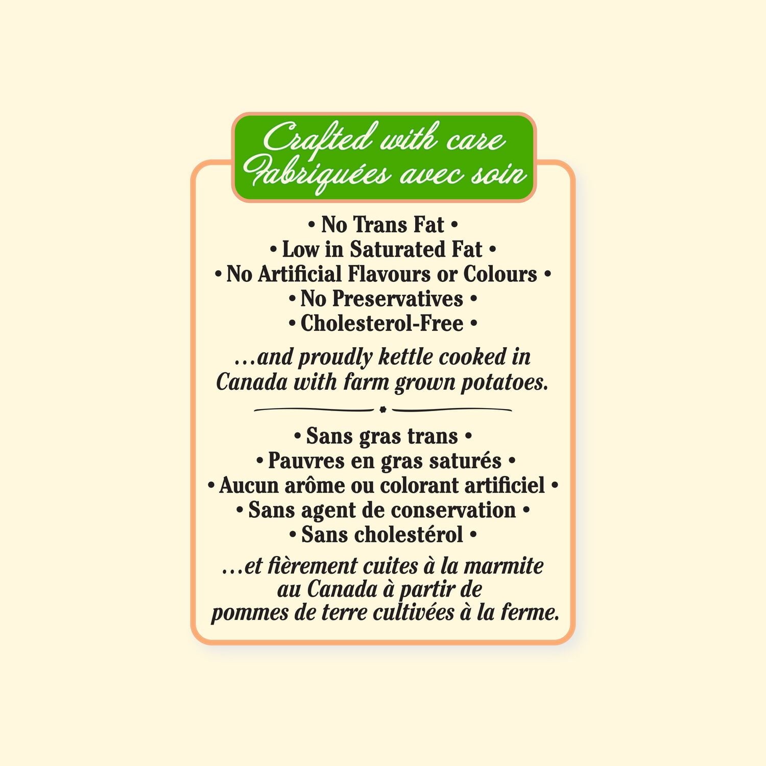 Miss Vickie's Jalapeño flavour kettle cooked potato chips have no trans fat, are cholesterol-free, and are low in saturated fat per 50 g serving. No artificial flavours or colours, and no preservatives! Oh, and no MSG!