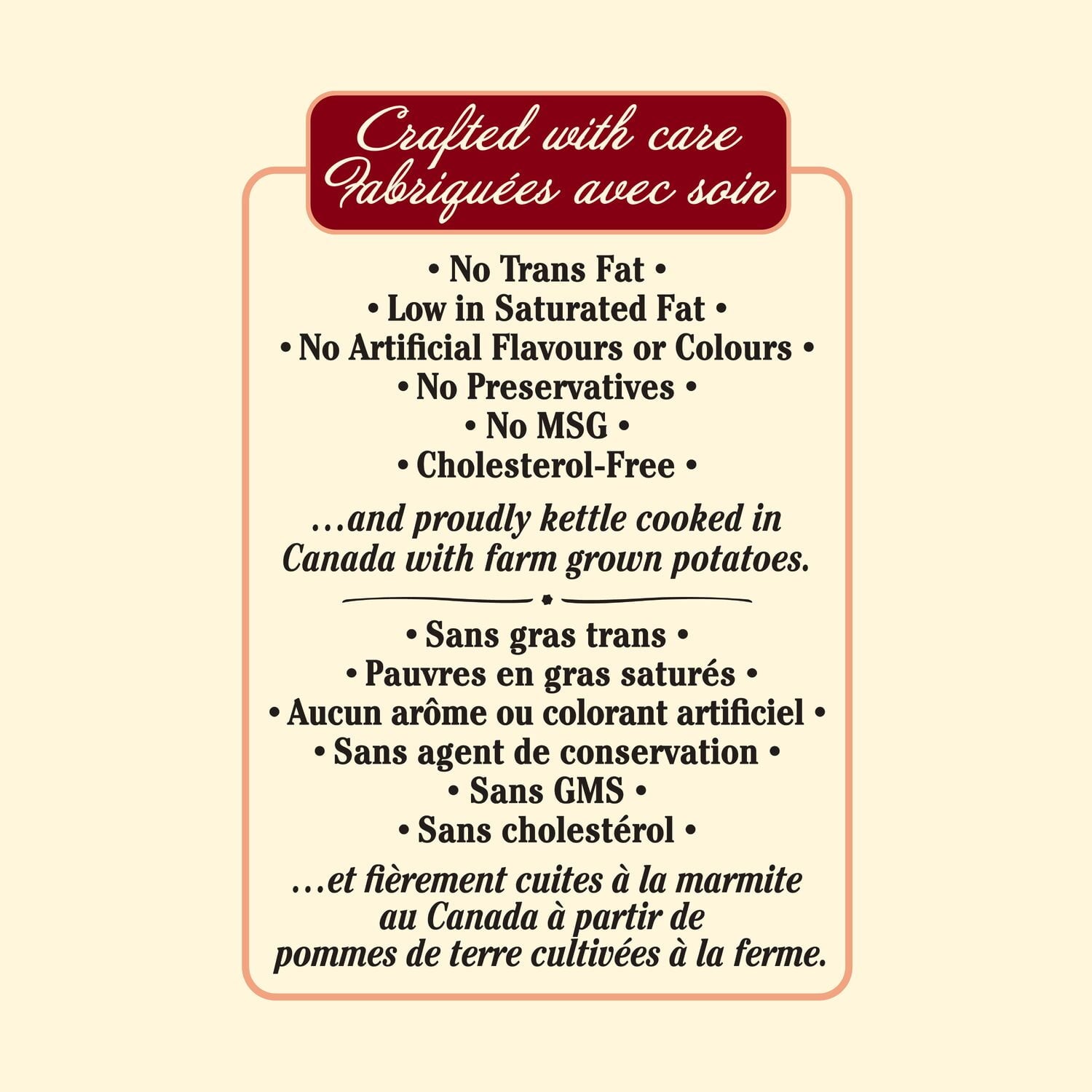 If you love crunch, you’ll love Miss Vickie's Original Recipe kettle cooked potato chips! They've got just the right amount of sea salt and are cooked one batch at a time for that signature Miss Vickie's crunch. Crafted with care since 1987, these chips are still kettle cooked using farm-grown potatoes and crafted with quality ingredients. Made with no trans fat, cholesterol-free, and low in saturated fat per 50 g serving. No artificial flavours or colours, no preservatives. Kosher and gluten-free. Oh, and no MSG.