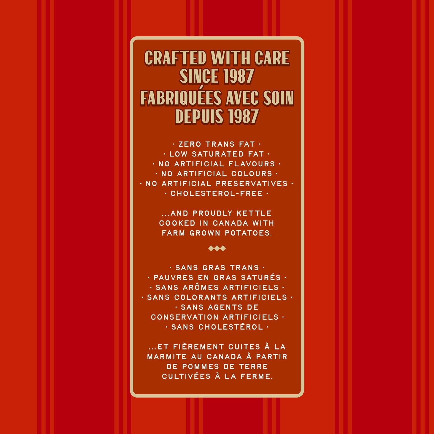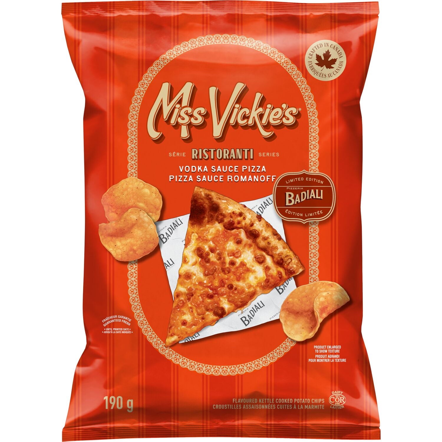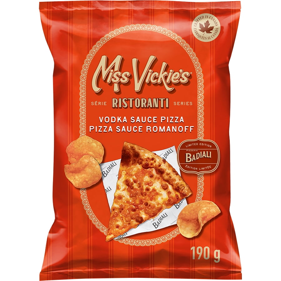 Celebrate some of Canada's best Italian restaurants with Miss Vickie's Vodka Sauce Pizza flavoured kettle cooked potato chips. Enjoy cheesy, tomato flavour along with Miss Vickie's signature crunch and texture in this delicious snack. These chips contain zero trans fat and are low in saturated fat; they also have no artificial flavours, colours, or preservatives. They are cholesterol-free and kosher certified. From Miss Vickie's Limited Edition Ristoranti Series, featuring Pizzeria Badiali. Crafted in Canada from domestic and imported ingredients.