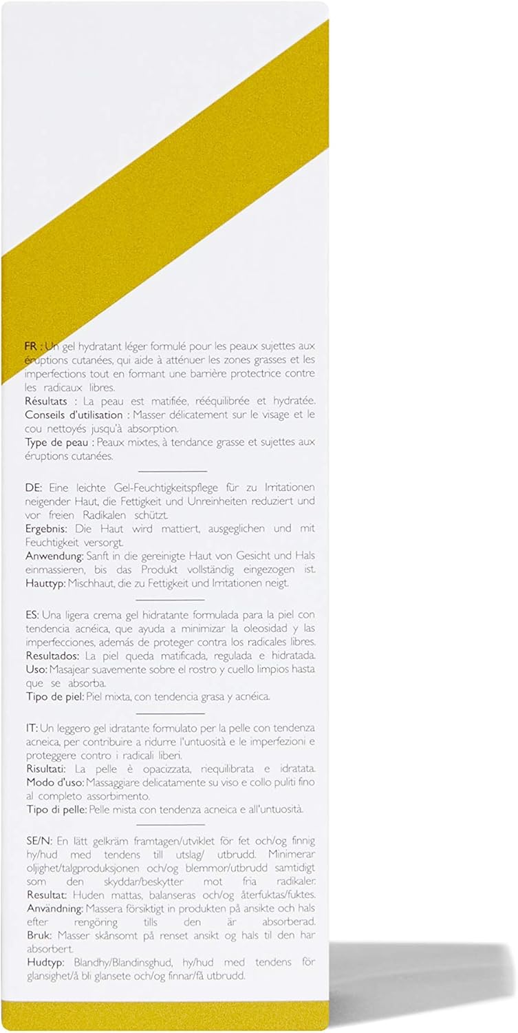 A gel moisturizer for combination skin, designed to do away with shine, leaving skin matte and hydrated. This light gel works to remove excess sebum, combatting the appearance of oiliness and calming blemishes. As well as leaving the skin balanced and hydrated, it helps to protect against harmful free radicals and future breakouts.