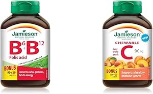 Vitamin B6, Vitamin B12 and Folic Acid, 110 Count (Pack of 1)Jamieson B6 + B12 and Folic Acid, when taken once per day, promotes the maintenance of good heart health. The combination of B6, B12 and Folic Acid helps maintain and lower homocysteine levels which are associated with the development of heart disease.Jamieson Chewable Vitamin C 500 mg - White Juicy Peach Flavour, 120 Count (Pack of 1)Jamieson Vitamin C Chewables deliver 500 mg of vitamin C in each tablet. Vitamin C supports immune health and provides a source of antioxidants for the maintenance of good overall health. With no added colours or flavours, these great-tasting tablets are the fun and delicious way to supplement with vitamin C.