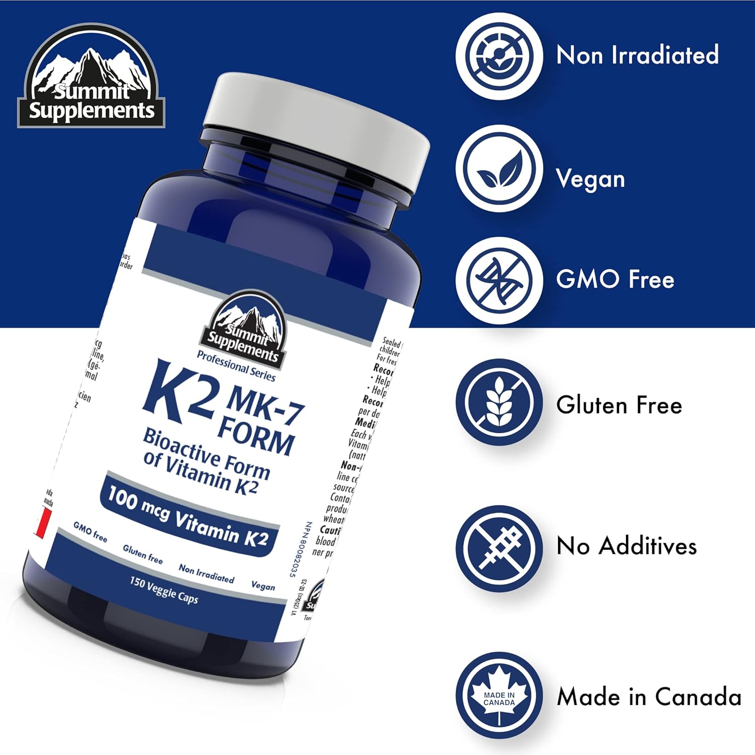 Discover the positive effects of Summit Supplements Vitamin K2 MK-7, a wonderful addition for nurturing your bone strength routine. This very active form of vitamin K2, sourced from natto beans, provides 100 mcg of potent support in each easy-to-take vegetarian capsule. Made in Canada and free from GMOs and gluten, this supplement helps guide your body's calcium to where it’s most needed—your bones—while also supporting balanced circulation. Make this key vitamin a part of your daily health habits for stronger bones and a more supported cardiovascular system.Imagine a supplement that works beautifully with calcium and vitamin D to help improve the well-being and strength of your bones. Summit Supplements Vitamin K2 MK-7 does just that, offering a wonderful contribution to your bone density. Tailored for those who prioritize both heart and bone well-being, these capsules assist your skeletal system in using calcium effectively, helping to improve both bone well-being and cardiovascular health. Made with exceptional ingredients, this supplement is also part of a plastic-negative approach, providing peace of mind for both you and the environment.Embrace the benefits of Vitamin K2 MK-7 with this exceptional 150-day supply. Whether you're supporting bone strength as part of your daily nutrition or focusing on cardiovascular health, these capsules offer a dual benefit in a convenient form. Experience the optimized blend with calcium and vitamin D3 to enhance your body’s strength and vitality, taking your wellness routine to a new level. Choose Summit Supplements for dependable health support that’s crafted with care and purity in mind.