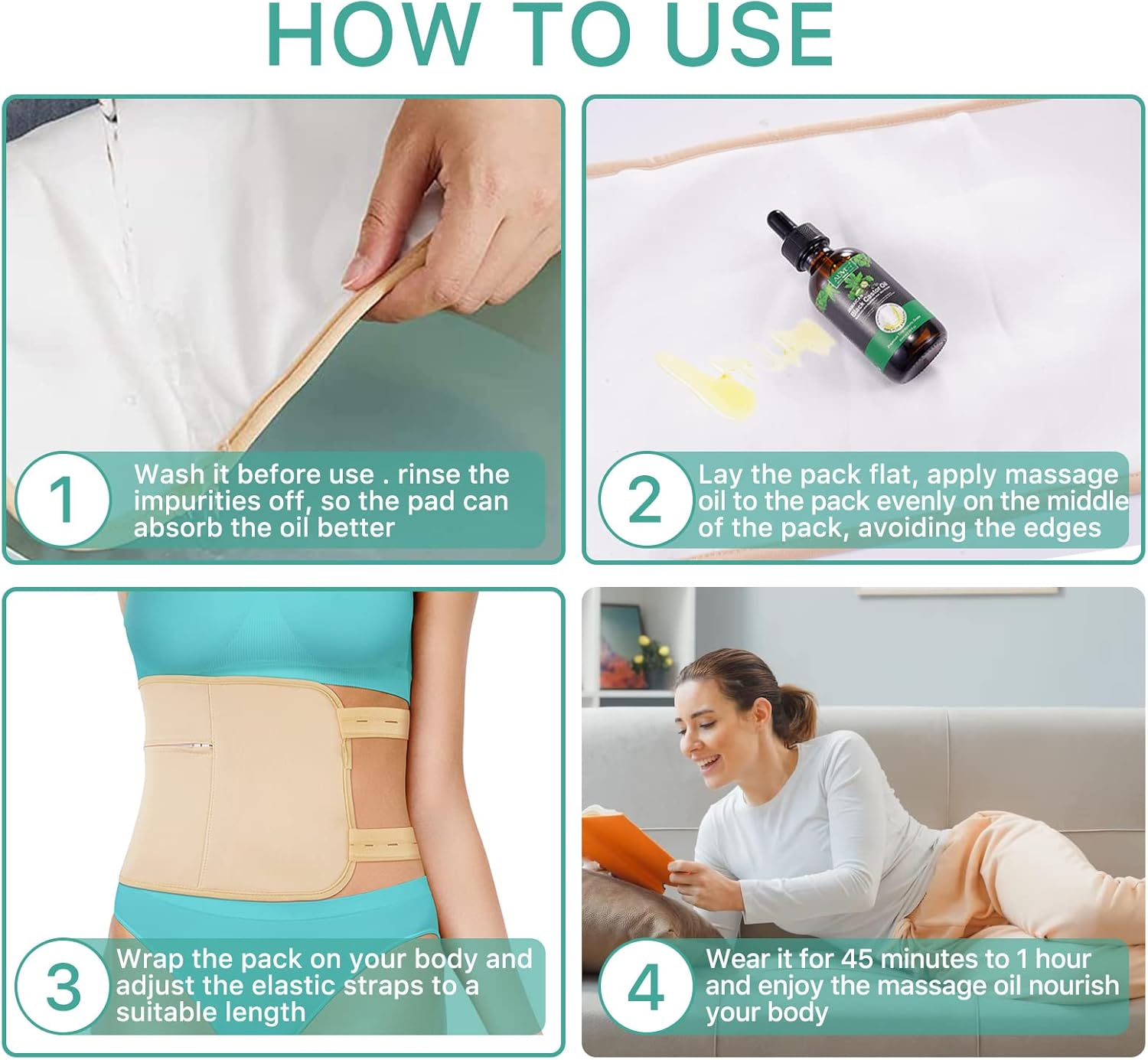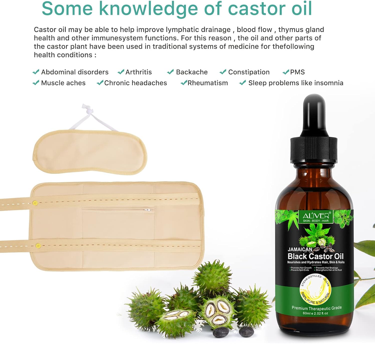 Castor Oil Pack Be Relaxed: 1, No Mess 2,Flexible Adjustable 3, Skin-friendly 4, No Leakage5, Deep Use of Castor Oil How To Use: 1, Lay the Castor Oil Pack flat with soft cotton side facing up. 2, Evenly apply the castor oil in the center of the pack, avoid the edge. 3, Place Castor Oil Pack on liver (under right rib cage) or around area you want, adjust the buttons to fit body. 4, Wear it every day 45-60 mins, or overnight and enjoy the castor oil nourishing your body. Package Included: 1x Khaki Castor Oil Pack Kit (Waist Wrap+Neck Wrap)1x Organic Castor Oil(60ml / 2.02 fl.oz)