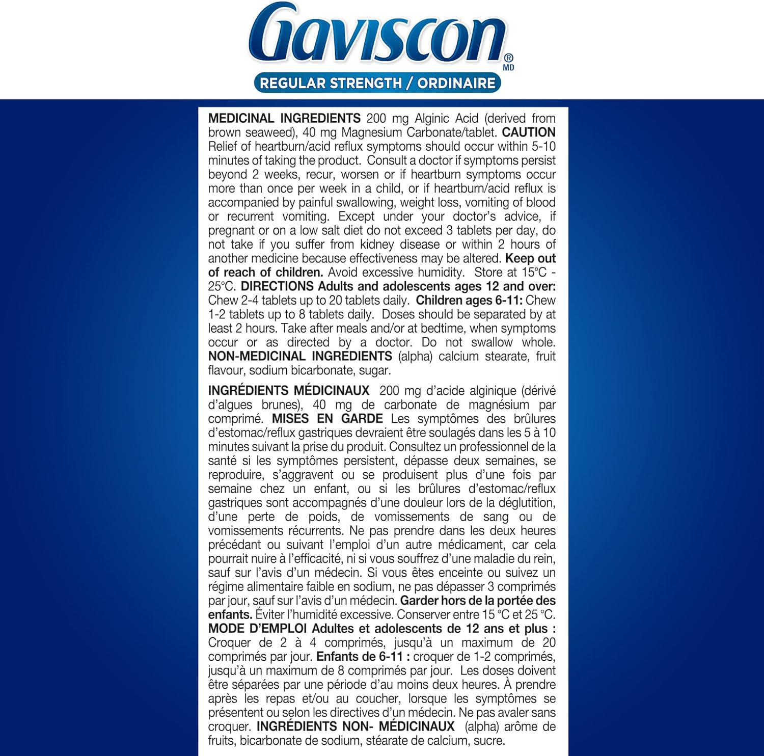 Gaviscon Regular Strength Chewable Foamtabs begin working immediately. Provides day & night-time relief of heartburn, acid reflux and GERD (Gastro-Esophageal Reflux Disease) symptoms. Doctor recommended Gaviscon forms a protective foam barrier that blocks acid reflux for hours. Free from aluminum, lactose & gluten. Fruit Blend flavour; 100 count.