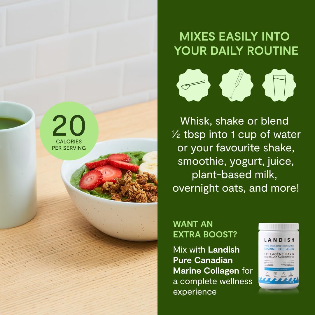 This nutrient-packed greens blend supports energy, digestion, mood, and overall wellness, making it perfect for anyone feeling a bit sluggish or undernourished. Each serving is packed with Canadian-grown organic leafy greens, and boosted with the world’s finest spirulina, functional roots, and adaptogenic mushroom extracts, giving you a daily dose of phytonutrients and antioxidants. Experience the difference with a formula that prioritizes quality and local sourcing. That’s why Landish Adaptogenic Greens Blend has a straightforward ingredient list, ensuring each one is carefully selected to meet high standards for purity and effectiveness. By working with local Canadian growers dedicated to regenerative farming, we proudly support sustainable agriculture that’s good for you and the planet. Made in Canada, choose a vegan, paleo-friendly, gluten-free, grain-free, and dairy-free option, with no artificial flavours, colours, or sweeteners. Just mix ½ tbsp into 1 cup of cold water or add it to your favourite smoothie, yogurt, juice, plant-based milk, or overnight oats for a quick and nutritious boost. With 30 servings in each pouch and no plastic scooper to reduce waste, it’s an easy and convenient addition to your daily wellness routine. For an extra wellness boost, try it with Landish Pure Canadian Marine Collagen!