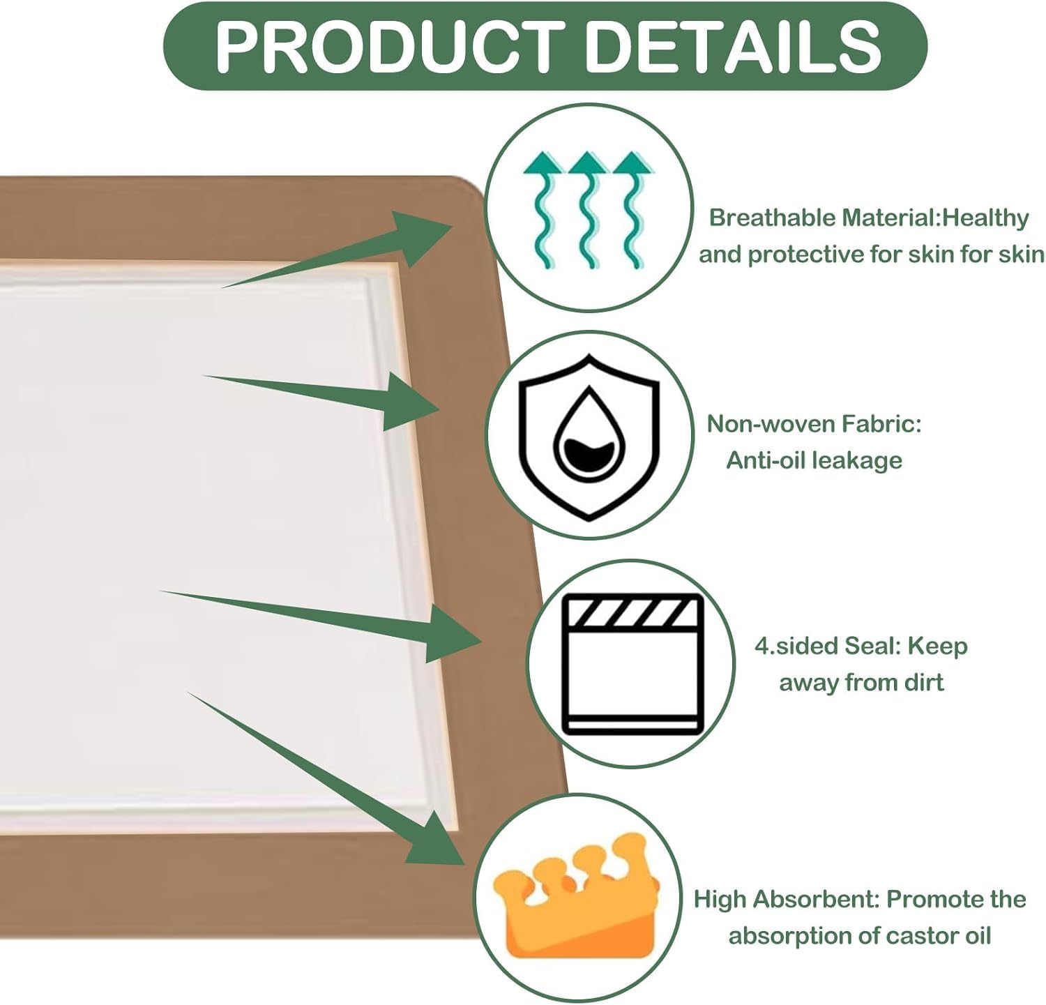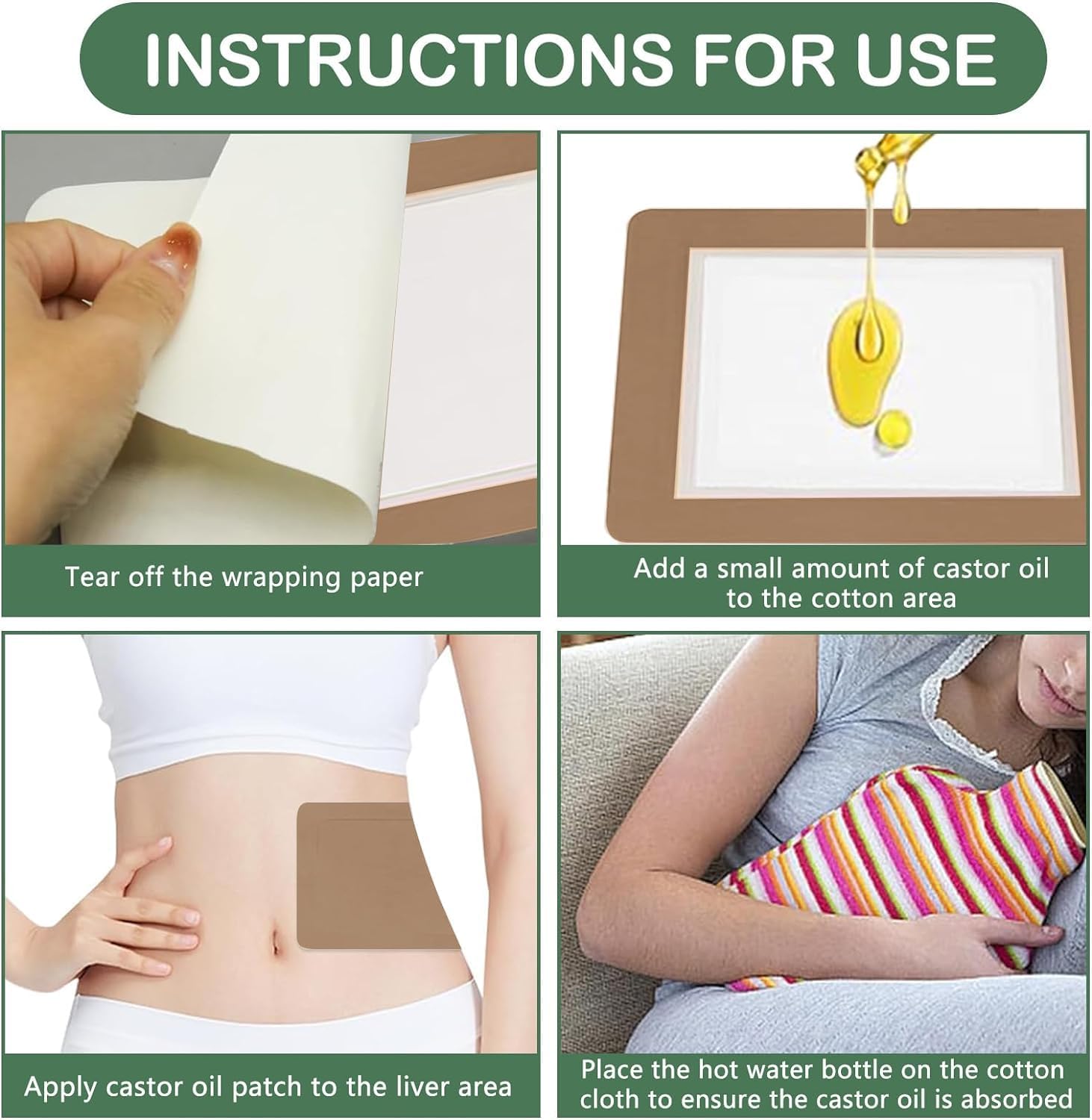 【High-Quality Material】 The castor oil packs are made from organic cotton and come with an adhesive backing that makes them highly adhesive, hypoallergenic, and skin-friendly. The adhesive also will not leave any residue or cause any skin irritation. The non-woven castor oil pack is breathable and not stuffy..【No Clean】Compared to traditional castor oil pack wrap organic cotton, our small disposable castor oil patches can be used or replaced anytime. There is no need to clean the greasy castor oil compress, just tear it off and throw it away..【How to Use】Self-adhesive castor oil pack is easy to wear for 1 hour daily or ideally overnight. When using castor oil patches, first tear off the release paper on the back, add an appropriate amount of castor oil on the cotton cloth, and then stick the castor oil compress where needed. Do not use castor oil packs when you are pregnant..【Multi-Applications】Our castor oil packs are self-adhesive, which used a hypoallergenic adhesive for strong stickiness, allowing the castor oil pack wrap organic cotton to adhere securely to the skin without shifting or curling. So you can wear this castor oil pack compress while working, sleeping, or even doing yoga, Take it and use it at any time, covering more life scenes..【Package】The package contains 30 pieces coffee castor oil patches, available in 3 sizes of 10 each. The dimensions of the castor oil packs are approximately 20×20 cm/7.87×7.87 inches for the large size, approximately 20×15 cm/7.87×5.9 inches for the medium size, and approximately 15×12 cm/5.9×4.72 inches for the small size.