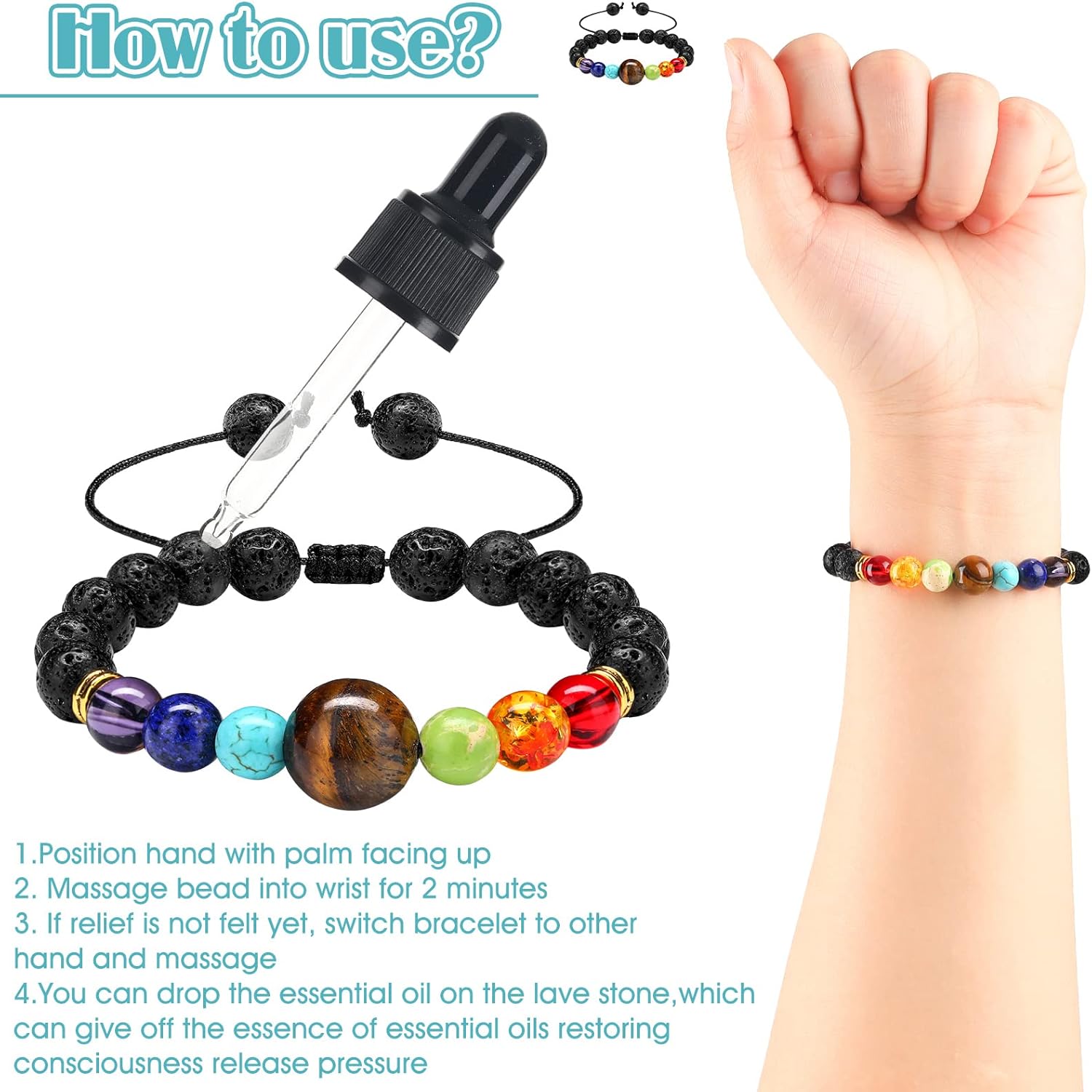 Features: Multiple uses: Morning sickness bracelets not only fit to relieve nausea, combat anxiety, headache and dizziness, but also can be applied as exquisite ornaments for a variety of occasions, such as weddings, parties, birthdays, anniversaries, graduations, holidays and other celebrations, making you stand out from the crowd and confident. Nice gift choices: In order to show you care, you can use these anti nausea bracelets as gifts sent to friends, family members, colleagues and neighbors, they will be happy to receive such nice and practical gifts. Specifications: Material: lava stone, chakras stone Color: as the pictures shown Size: Anti motion sickness bracelet: about 18 cm/ 7.1 inches The largest bead: about 1.4 cm/ 0.55 inches The smallest bead: about 0.6 cm/ 0.24 inches Package includes: 6 x Anti motion sickness bracelets Notes: Manual measurement, please allow slight errors on size. The color may exist slight difference due to different screen displays.