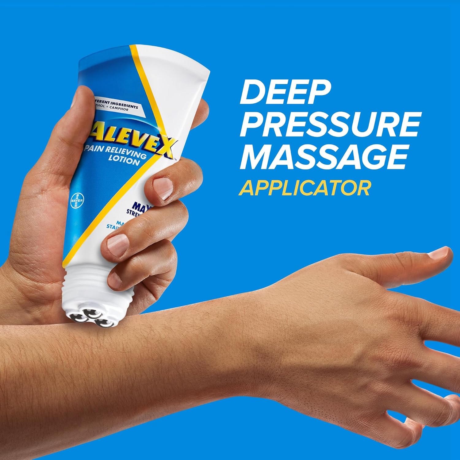 "New AleveX Topical Pain Relieving Lotion provides fast, cooling pain relief and features a specially designed rollerball applicator for targeted massage Experience fast relief from back pain, arthritis pain, and muscle discomfort with this pain relief lotion. Our formula combines max strength menthol with camphor for fast-acting, long-lasting cooling relief. Say goodbye to discomfort and hello to comfort AleveX provides targeted relief with ease. Its three cool-to-the-touch stainless steel rollerballs deliver fast, cooling pain relief while targeting and massaging pain points. Soothe neck pain, knee pain, and muscle discomfort with AleveX pain relieving lotion. The applicator's design allows for precise application and deep pressure massage, alleviating pain and tension. Unlike other topical pain relief products that can feel sticky or greasy on the skin, the smooth, lightweight formula of AleveX menthol and camphor lotion is easily applied, with a long lasting cooling sensation. AleveX is also enriched with 6 essential oils: Frankincense, clove, eucalyptus, linseed, peppermint, and rosemary. Enjoy the transition from cooling menthol to a soothing herbal scent with fresh, aromatic notes. Don't let pain hold you back. Whether seeking joint pain relief, muscle pain relief, or back pain relief, AleveX has got you covered. With fast-acting menthol and camphor, and targeted deep pressure massage application, experience effective and long lasting pain relief. Try AleveX Topical Pain Relieving Lotion with targeted massage roller and say goodbye to pain and get back to doing what you love For optimal results, apply thinly and evenly to the affected area 3-4 times per day. For adults and children 2 years and older. To be sure this product is right for you always read and follow the label."