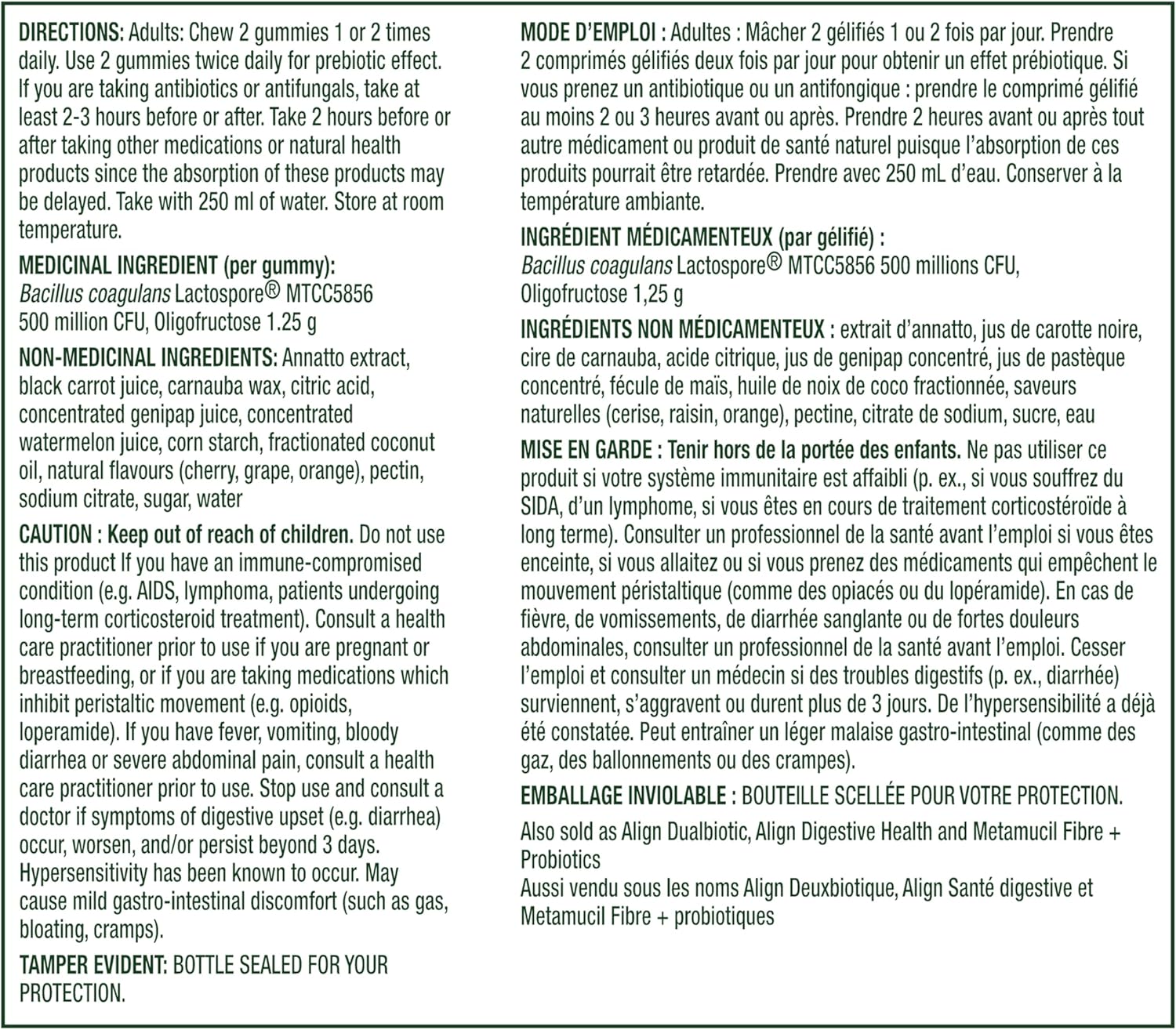 Align Regularity Support Probiotic helps provide gentle relief of constipation and irregularity. Good bacteria are essential to support a healthy gut. Align Regularity Support gummies are made with prebiotics to help stimulate the growth of healthy bacteria in your intestine, and probiotics to help support gastrointestinal health. Plus, every great-tasting gummy is packed with delicious fruit flavours and each serving has only 1 gram of sugar. Align Regularity Support gummies contain the probiotic, Bacillus Coagulans MTCC5856 LactoSpore®, and the prebiotic, Oligofructose. Among Doctors and Gastroenterologists who recommended a brand of probiotic in ProVoice 2024 survey. To ensure this product is right for you, always read and follow the label.