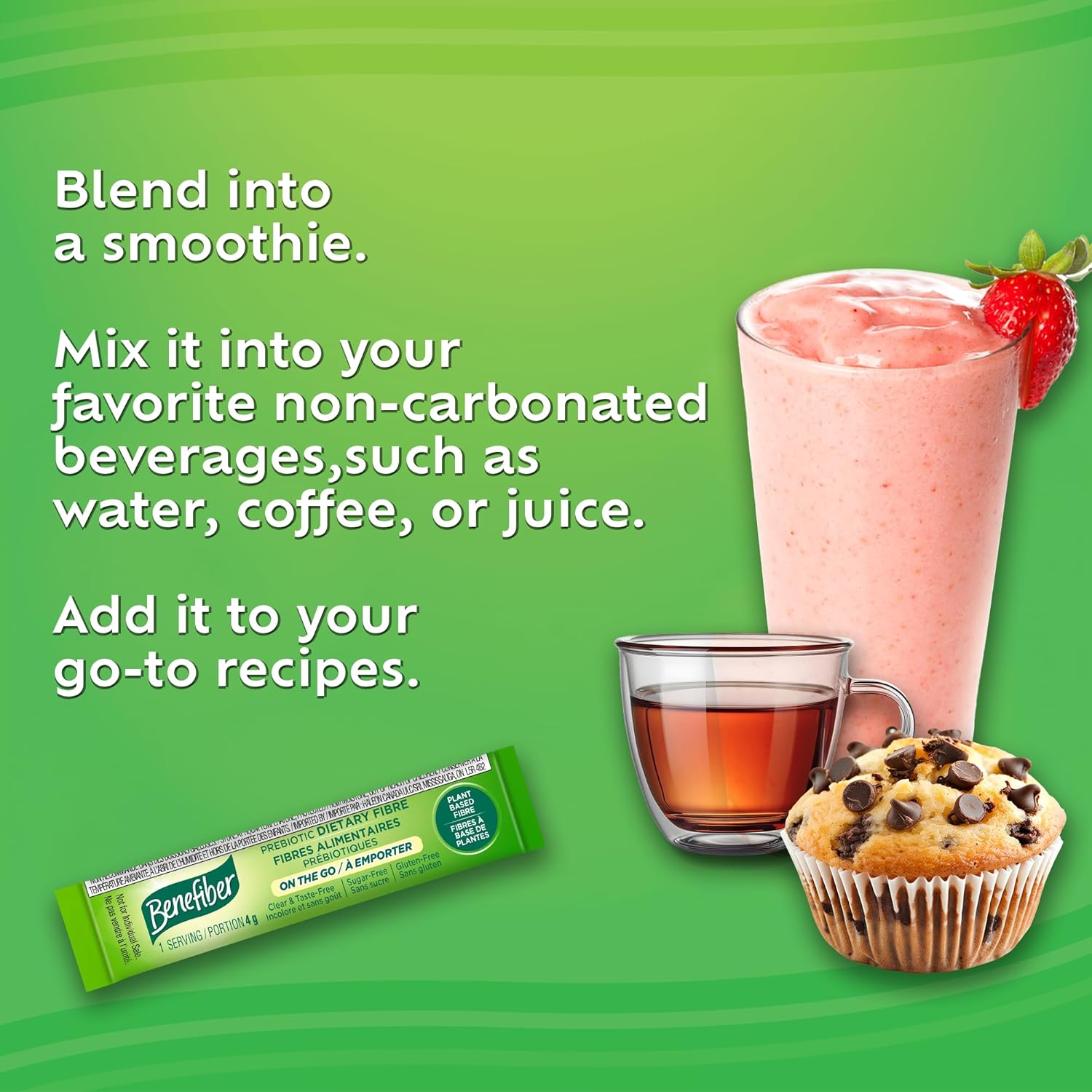 Benefiber On The Go Prebiotic Dietary Fibre Powder Stick Packs offer a convenient, pre-measured, single serving solution to help you easily add more fibre to your diet. This unflavoured powder contains plant based fibre, wheat dextrin, to support your overall wellness without interrupting your busy day. Sugar-free, gluten-free, taste free, and grit-free, this fibre powder dissolves completely and clearly in foods and non-carbonated beverages like water, coffee, or juice, and you can easily add it to your favorite recipes by baking or cooking with it. For ages 6 and older, simply stir 1 stick pack of Benefiber On The Go Prebiotic Dietary Fibre Powder into at least ½ cup (120 mL) of any beverage* or soft food (hot or cold). Stir well until dissolved (up to 60 seconds). *Not recommended for carbonated beverages. Make Benefiber Prebiotic Dietary Fibre Powder a part of your daily routine and support your overall wellness.