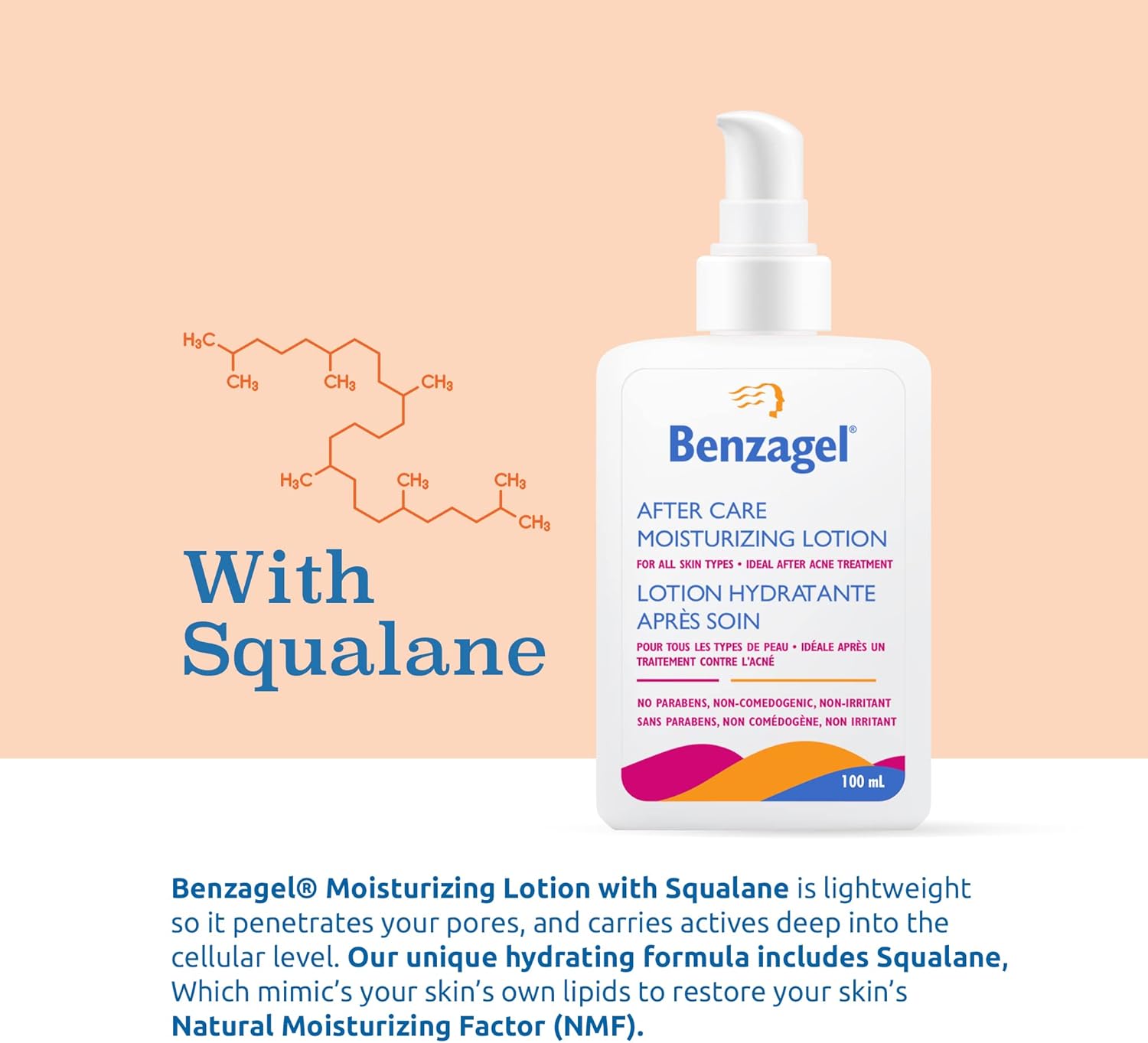 Some acne treatment products can leave your skin feeling dry and uncomfortable. That’s why Benzagel created a new formula to help. Benzagel After Care Moisturizing Lotion is a lightweight, hydrating lotion that nourishes and replenishes your skin’s moisturizing factor (NMF), making it the perfect last step in your skincare routine. With a formula based on a unique combination of Squalane, Alpha Hydroxy Acids (AHAs), botanical extracts, minerals and antioxidants, our lotion gently exfoliates and nourishes your skin while moisturizing. It is made with premium ingredients and is paraben-free, non-irritant and non-comedogenic, making it safe and effective for all skin types. Add Benzagel Acne After Care Moisturizing Lotion to your skincare routine for a hydrated, replenished feeling every time.