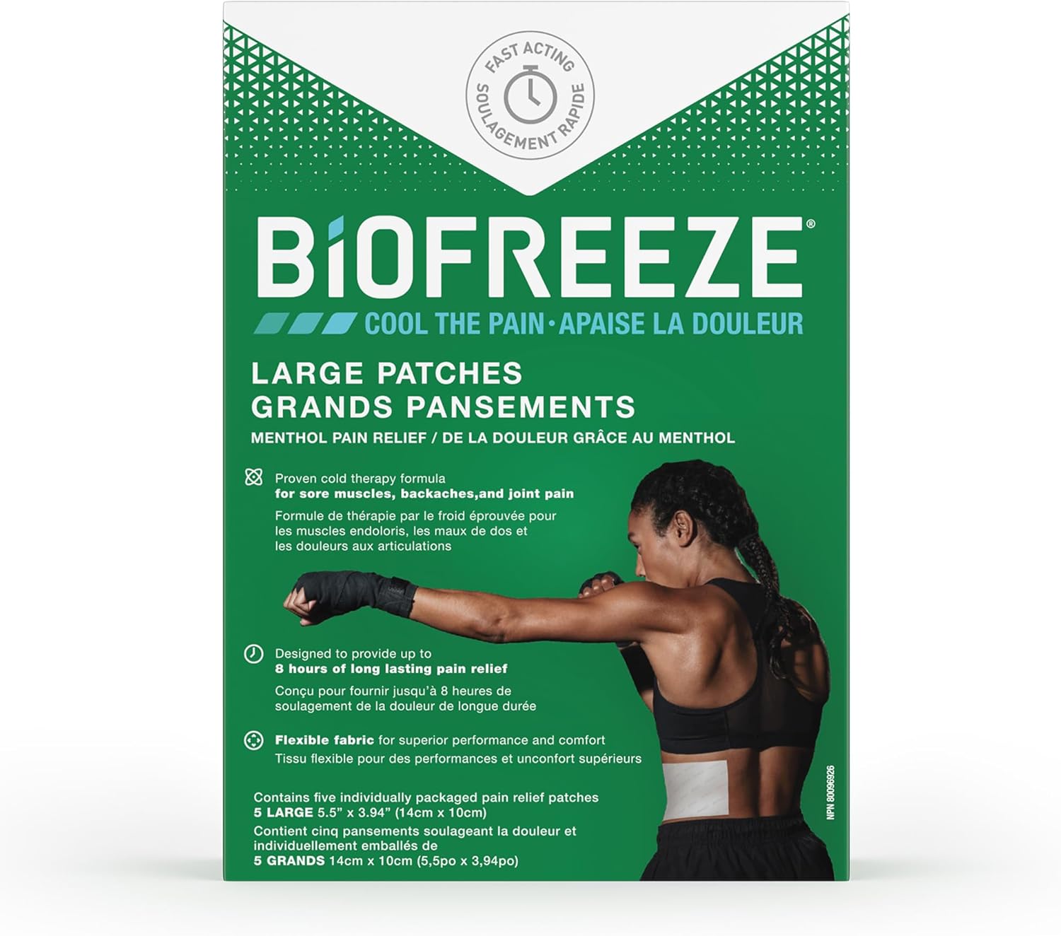 Biofreeze Patches (5 Large Size), Penetrating Pain Relief for Sore Muscles, Arthritis, Backaches, and Sore Joints, Fast Acting, Long Lasting, Cooling Menthol Formula, Mess Free Application, Flexible Fabric for Comfort,