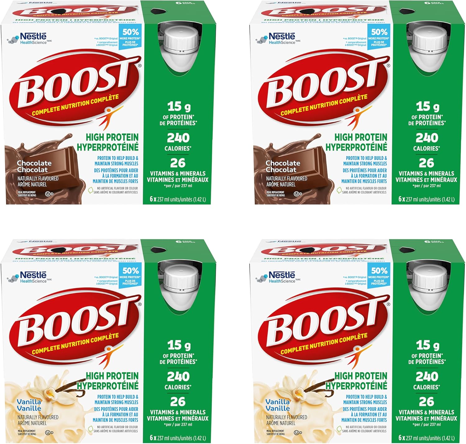 BOOST 15g Protein Meal Replacement Drink, Chocolate and Vanilla Variety Pack, 6x237ml, Case Pack of 4, Packaging May VaryBOOST High Protein is a convenient meal replacement drink that is great for recharging and refueling when you need additional protein with complete and balanced nutrition in your diet. With 15 g of protein to help build muscle and 26 essential vitamins and minerals per 237 ml, BOOST High Protein Meal Replacement Drink – Variety (12 x 237 ml Chocolate and 12 x 237ml Vanilla) is a convenient choice for those looking to stay strong. Plus, our recipe has no artificial flavors or colors, and natural source sweetener. You're guaranteed to love it or your money back*.Boost Fruit Flavoured Drink Variety Pack, 237ml, 24 countBOOST Fruit Flavoured Beverage isn't just an ordinary juice-box but complete nutrition. Packed with 8.8g of protein and 23 essential vitamins and minerals per 237 ml, plus a delicious light and refreshing taste we guarantee you'll love - it's perfect for your on-the-go lifestyle.