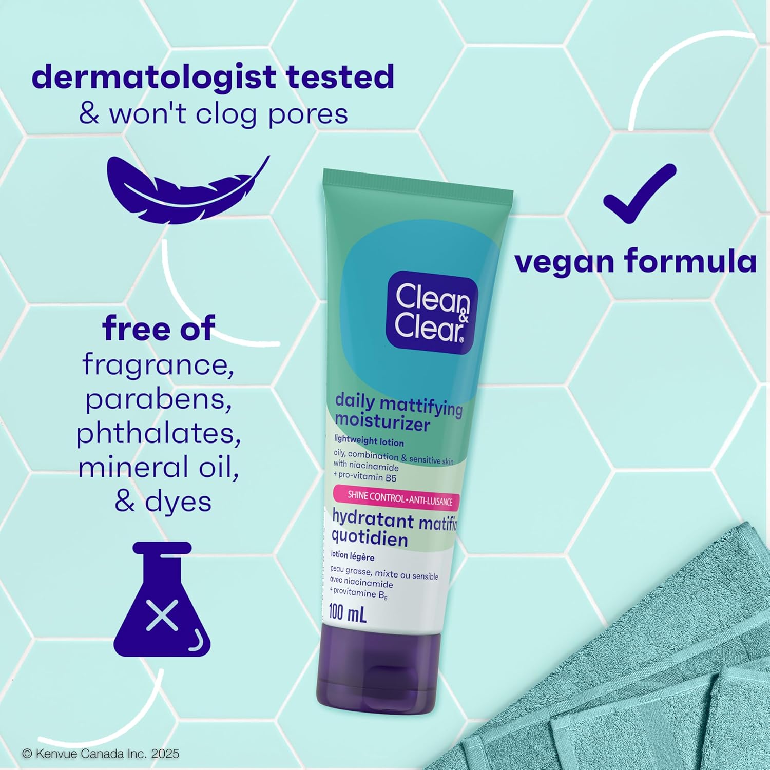 Clean & Clear Daily Mattifying Facial Moisturizer, Shine Control Face Lotion with Niacinamide & Pro-Vitamin B5 for Oily, Combination, & Sensitive Skin Care, Non-Comedogenic, 100 ml
