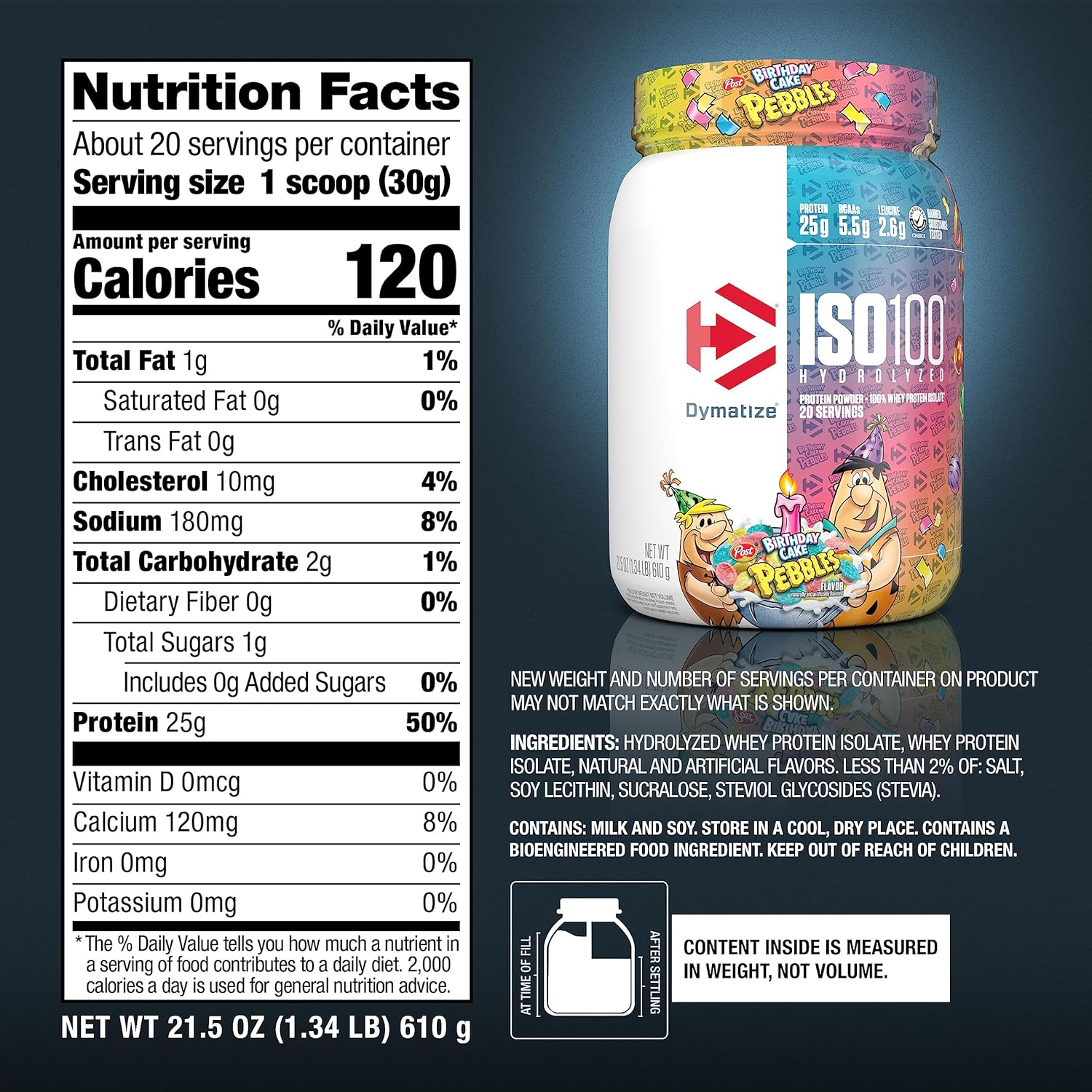 Dymatize ISO100 Hydrolyzed Protein Powder, 100% Whey Isolate Protein, 25g of Protein, 5.5g BCAAs, Gluten Free, Fast Absorbing, Easy Digesting, Birthday Pebbles, 20 Servings