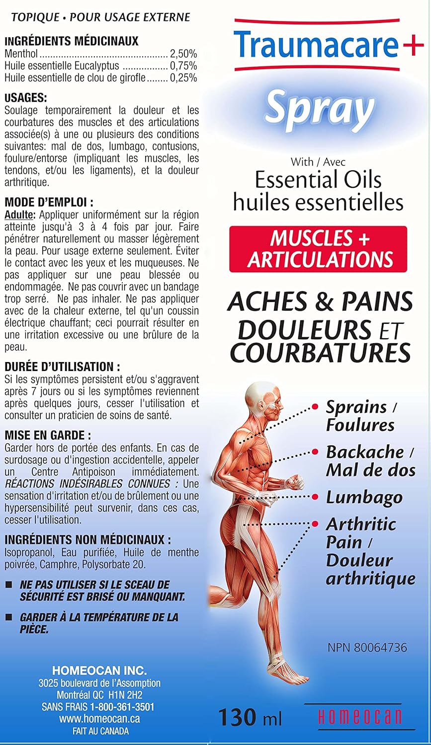 Homeocan Traumacare Spray 130ml, Eucalyptus Essential Oil for Sore Muscle & Joint Discomfort, Quick Absorption, Non-Greasy, Fragrance-Free, Travel Size, Effortless Application for Hard-to-Reach Areas