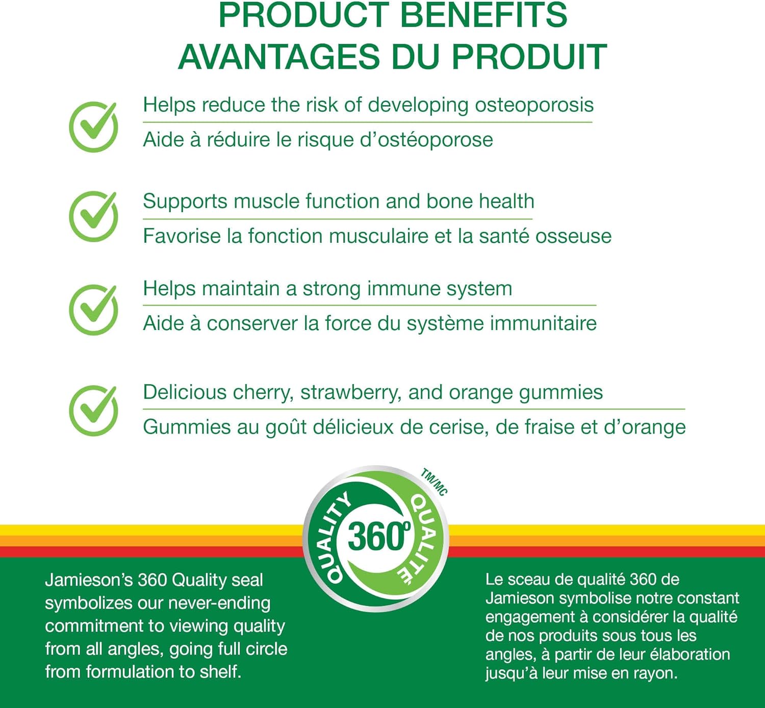 Jamieson Calcium 250 mg with Vitamin D3 400 IU Gummies, Cherry, Strawberry, and Orange Flavours, Helps Prevent Osteoporosis, Supports Strong Bones and Teeth. Non-GMO, Gluten-Free, No Artificial Colours, Flavours, or Pres…