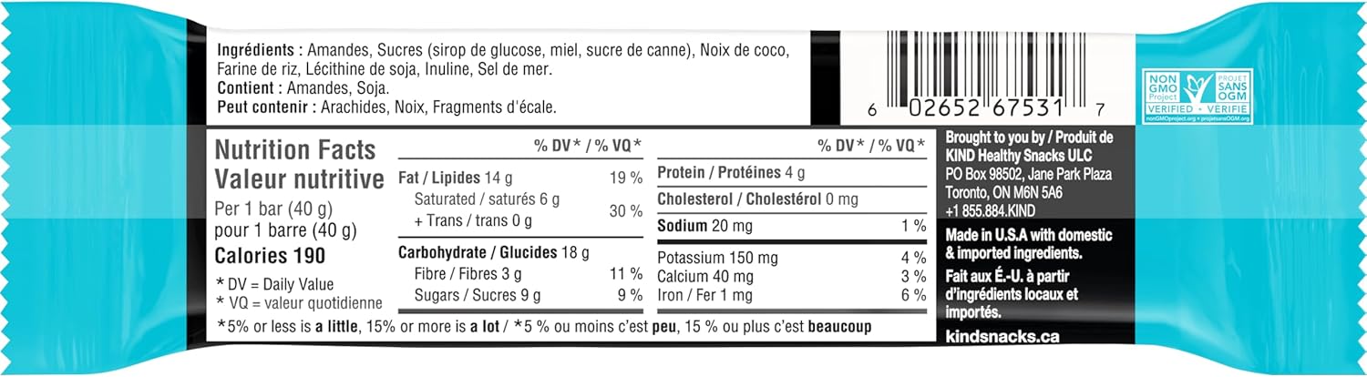 KIND Almond & Coconut bars are gluten-free snacks packed with almonds, coconut, and honey. Each bar is NON-GMO Project Verified and low in sodium. Individually wrapped for on-the-go convenience, they are a delicious source of fiber!