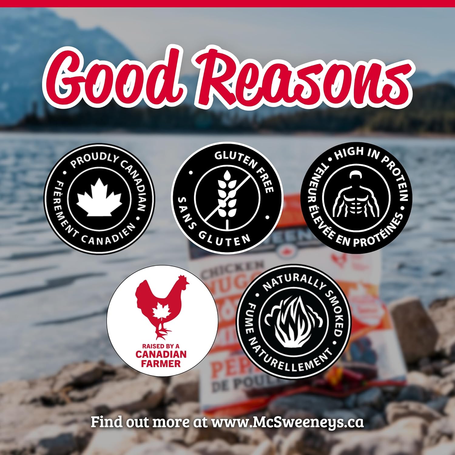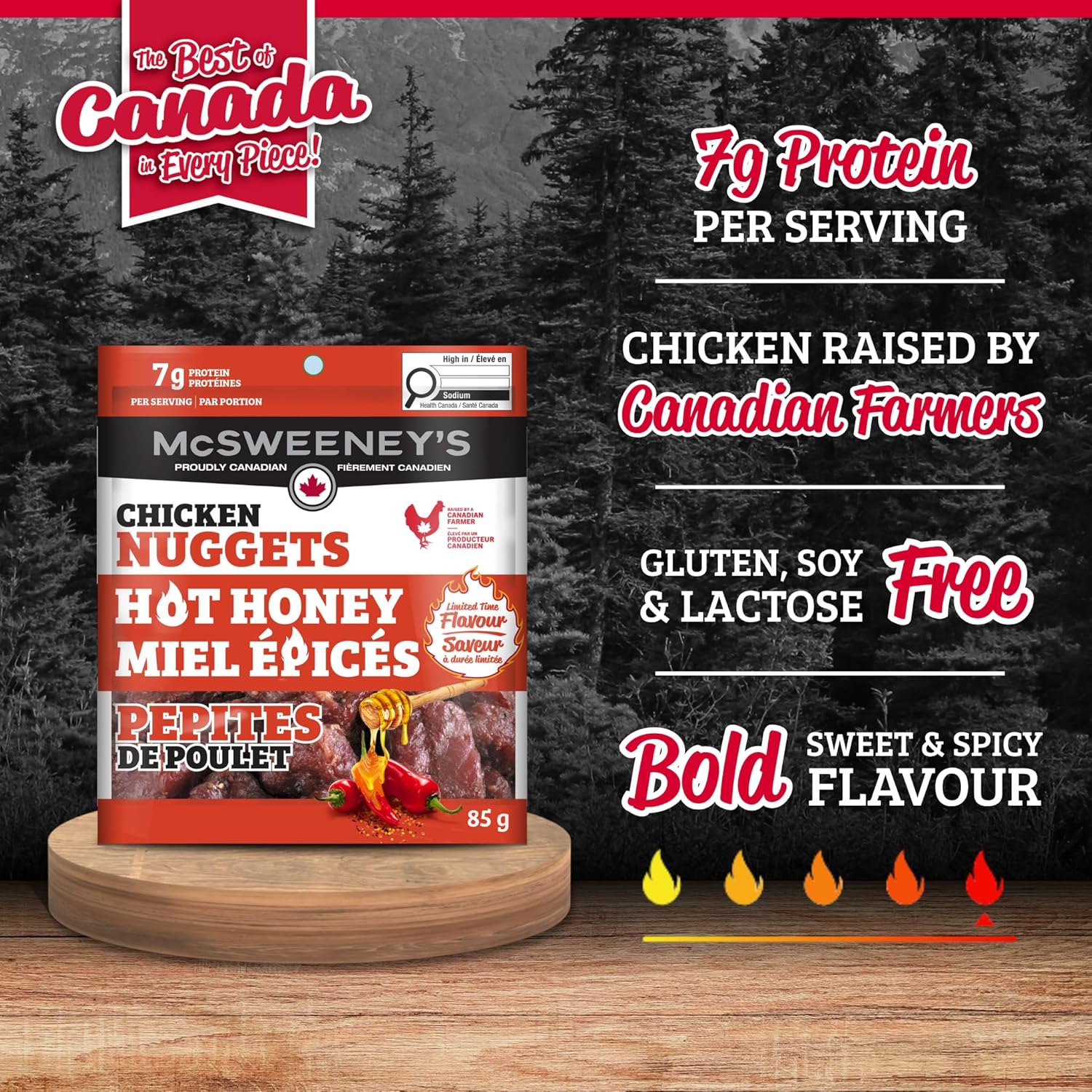Discover the bold, unforgettable taste of McSweeney’s Hot Honey Chicken Nuggets, a snack that brings together craftsmanship, Canadian pride, and crave-worthy flavour. Inspired by the rising popularity of hot honey across culinary trends, we’ve created a sweet and spicy profile that delivers a gentle kick of heat wrapped in golden honey sweetness.Each nugget starts with premium chicken raised on Canadian farms, chosen for its quality and consistency. Our time-tested natural smoking process infuses each piece with a deep, savoury flavour that enhances the signature hot honey blend. You’ll taste hints of garlic, spice, and sweetness in every bite, balanced for both flavour seekers and spice lovers alike.These nuggets are gluten-free, lactose-free, and soy-free, making them a thoughtful choice for families, athletes, and anyone following specific dietary needs. Whether you're fuelling up after a workout, packing a lunch, or curbing mid-afternoon cravings, McSweeney’s Hot Honey Chicken Nuggets offer clean protein with big flavour and no compromises.Made in Canada and crafted with care, this is no ordinary snack. It’s a premium meat snack that delivers the comfort of homestyle flavour with the boldness of modern taste trends, hot, sweet, savoury, and ready when you are.