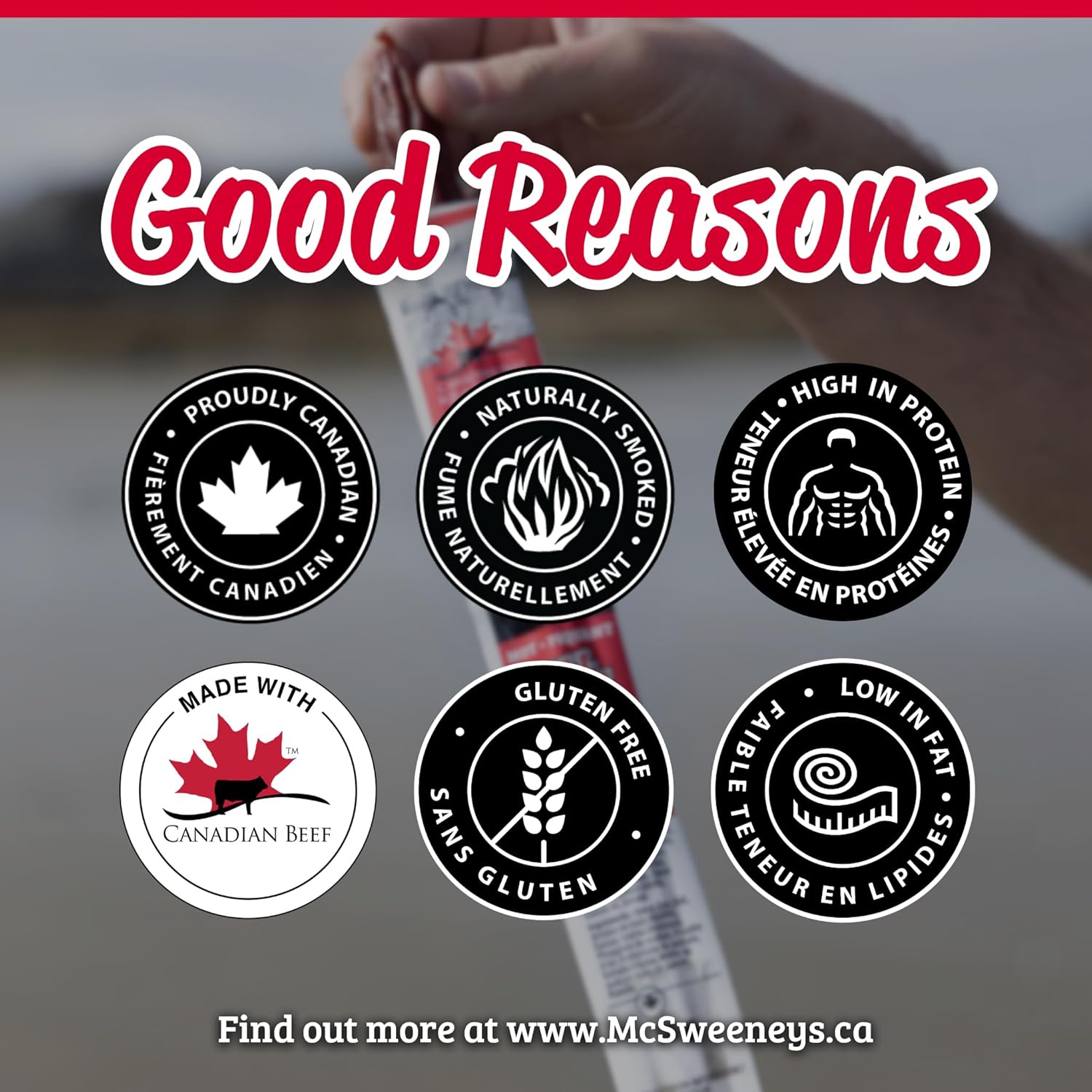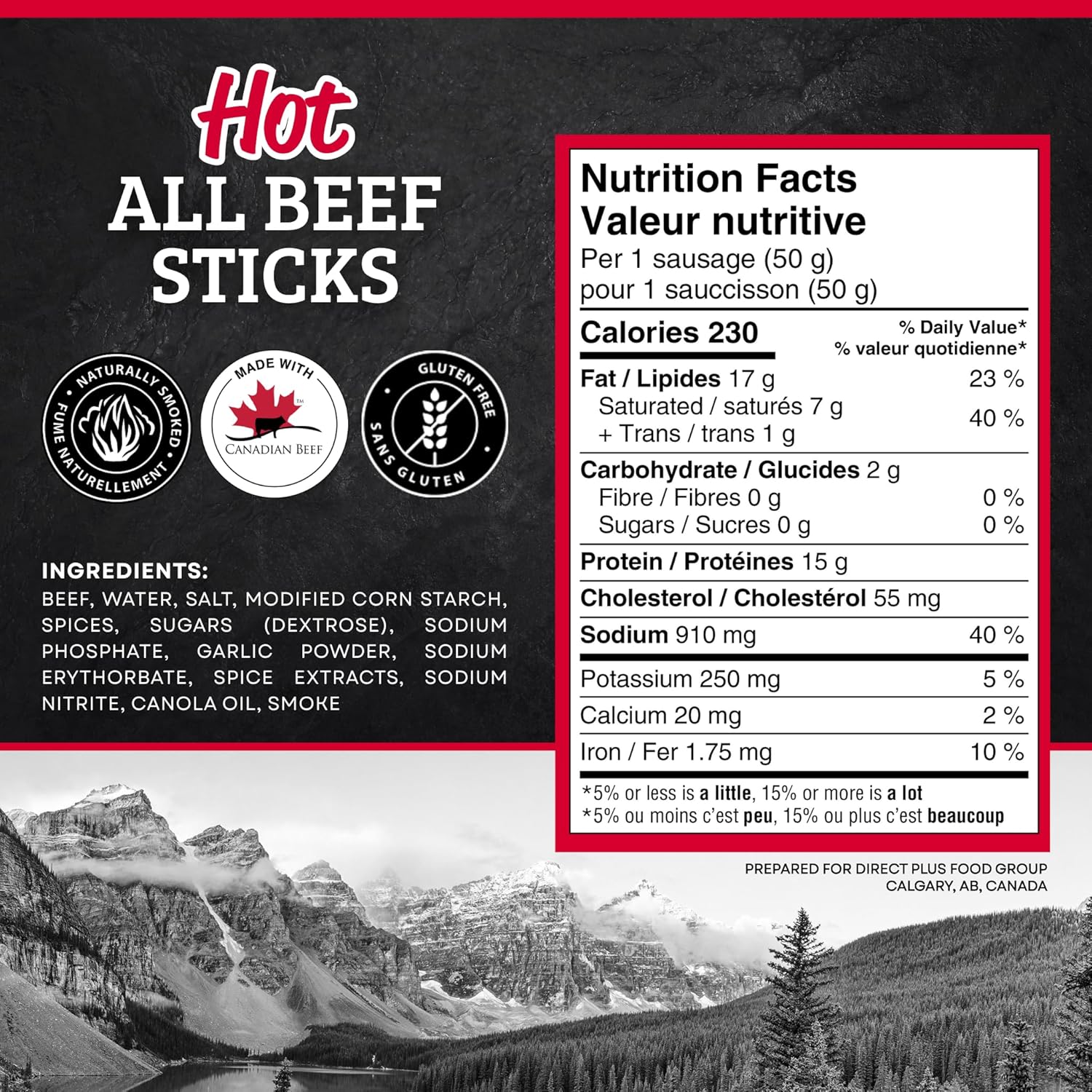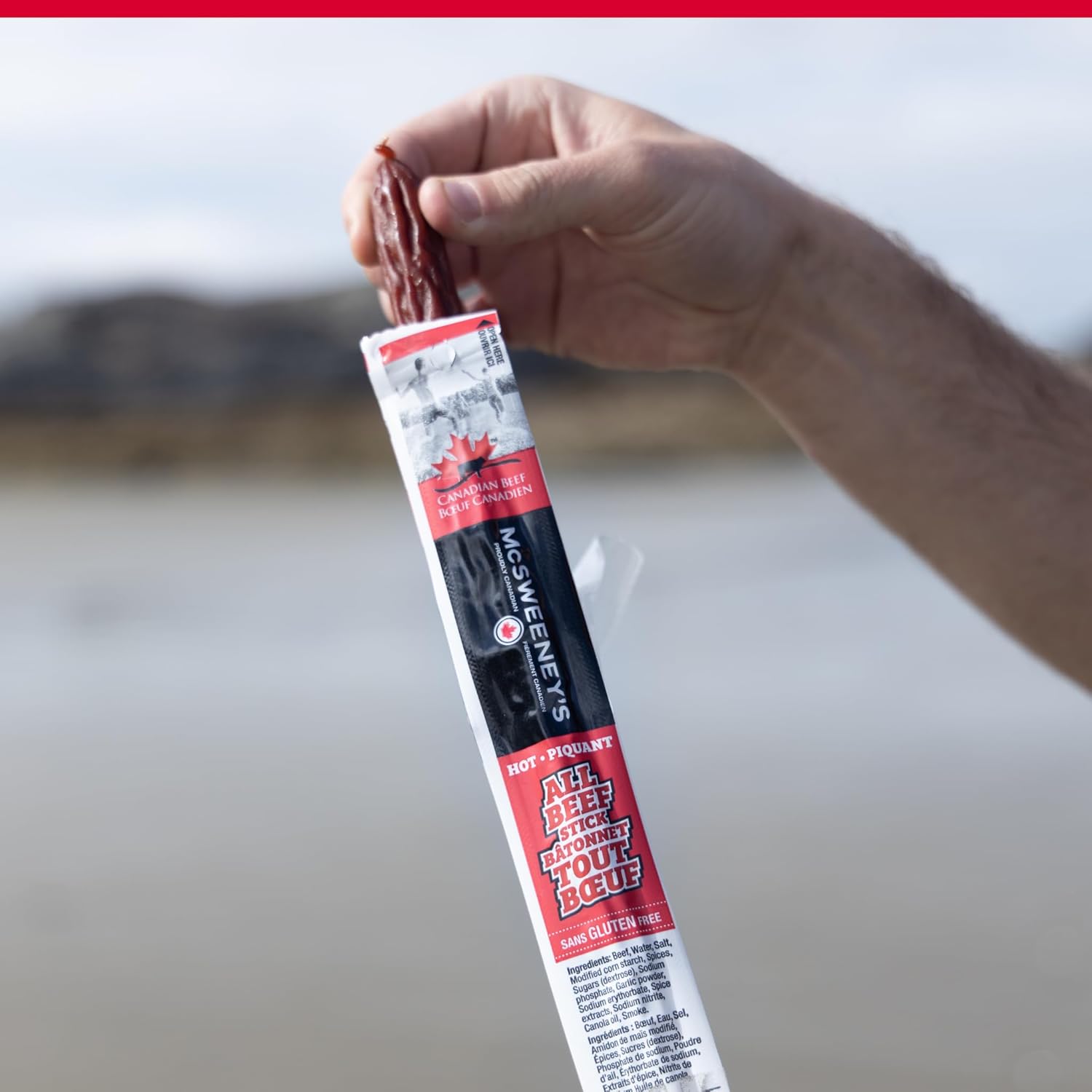 Convenient Snacking Anywhere: McSweeney's Hot All Beef Meat sticks are a medium-heat spicy snack made with 100% Canadian Beef, naturally smoked and packed with flavour. Each stick is individually wrapped and requires no refrigeration, making them ideal for road trips, hikes, or a quick bite at your desk. Each caddy contains 16 individually wrapped, ready-to-eat 50-gram sticks. They're the perfect snacks for adults and kids alike. If you love spicy snacks, try our hot all beef meat sticks today!.High Protein Snack: McSweeney's All Beef Meat Sticks have 15g of protein per serving to help you fuel your busy day. Whether you're hitting the gym or need a quick pick-me-up, these pepperoni sticks keep you energized and satisfied..Bold Heat with a Classic Smokehouse Finish: McSweeney’s Hot All Beef Sticks bring together the savoury richness of 100% Canadian beef and a bold blend of hot spices for a flavour that satisfies heat lovers. Naturally smoked and perfectly seasoned, these spicy beef sticks deliver a balanced kick of heat with a smooth, smoky finish in every bite..Proud To Support Canadian Meat Producers: All McSweeney's meat snacks are made from meat and poultry produced by Canadian farmers who are committed to the strict standards of our animal health and welfare program. In doing so, we not only improve the lives of animals raised for our products, but we hope our commitment will inspire the right behaviours from other meat snack producers and the farms that supply the Canadian livestock industry..Proudly Canadian Meat Snacks: For the past 30 years, McSweeney’s has proudly provided Canadians with delicious meat snacks crafted from premium, hand-selected beef, pork, and poultry made with care in Canada in a peanut, tree nut, fish, and seafood-free facility.Special Feature: Gluten Free. Brand: McSweeney's. Region produced in: Canada. Form: Stick. Serving recommendation: 50 grams. Package Information: Box. Manufacturer: McSweeney's. Allergen information: Contains: Gluten Free. Manufacturer reference: 25821. Units: 800.0 Grams. Product Dimensions: 9.1 x 7.8 x 27.9 cm; 50 g. Ingredients: Beef, Water, Salt, Modified corn starch, Spices, Sugars (dextrose), Sodium phosphate, Garlic powder, Sodium erythorbate, Spice extracts, Sodium nitrite, Canola oil, Smoke.. Serving size: 50 g. Protein: 15 g. Fat: 17 g. Carbohydrate: 2 g. - Sugars: 0 g. Item Weight: 50 g. ASIN: B09TPZJ39G. Customer Reviews: 4.1 4.1 out of 5 stars 3 ratings 4.1 out of 5 stars. Best Sellers Rank: #17,575 in Grocery & Gourmet Food (See Top 100 in Grocery & Gourmet Food)#97 in Jerky. Date First Available: June 15 2022.