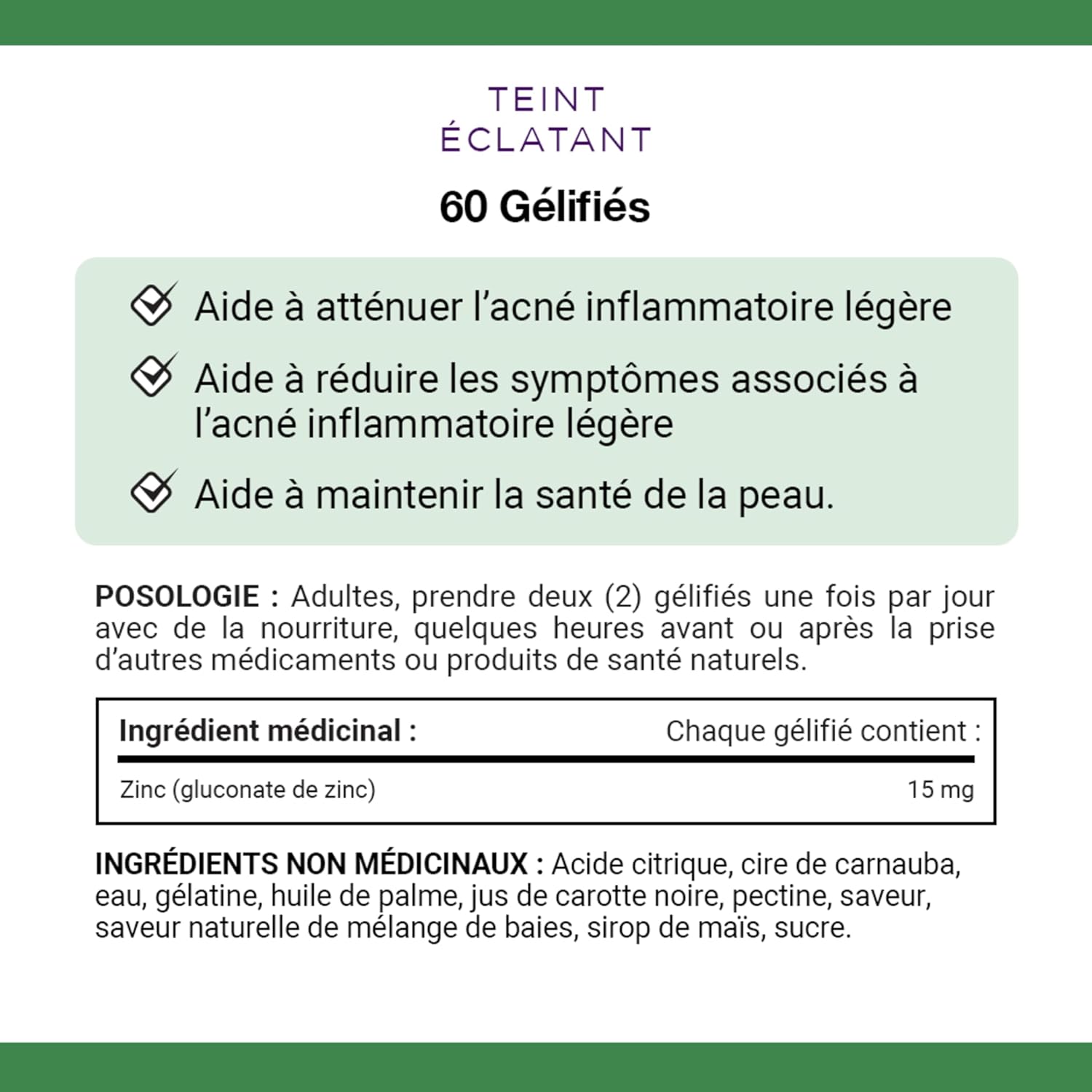 For over 40 years, NATURE'S BOUNTY has been making vitamins and nutritional supplements with you in mind. You take vitamins because you want to help your body to be at its best – so why settle for just any vitamin brand? Try NATURE'S BOUNTY today. NATURE'S BOUNTY Clear Complexion helps clear mild inflammatory acne. While helping to reduce the symptoms associated with mild inflammatory acne it also helps to maintain healthy skin. Each easy-to-take gummy contains 15 mg zinc as well as black carrot juice, carnauba wax, citric acid, corn syrup, flavour, gelatin, natural mixed berry flavour, palm oil, pectin, sugar, and water. Adults take two (2) gummies once a day with food, a few hours before or after taking other medications or natural health products.